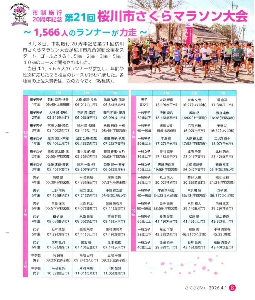 ハイキングクラブの松原操さんが3月8日(日)に開かれた桜川市さくらマラソン大会_10km一般男子60歳以上の部で第2位の好成績を収めました。その結果が、上位入賞者として桜川市の“広報さくらがわ2026/4/1”号に掲載されたので紹介いたします。松原さんはこれまでにもいろいろな大会で活躍されており、60代半ばを越えての今回の成績は更に重みがあり、今後の活躍に益々期待したいと思います。(小林治男 記)