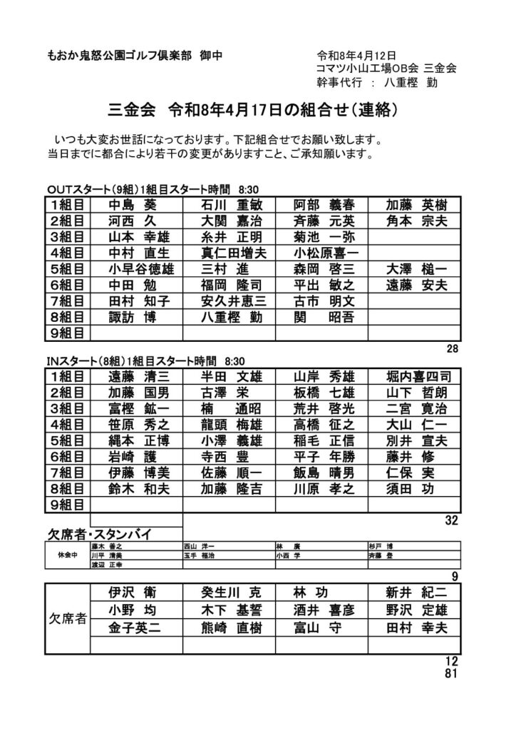 4月17日(金)三金会ゴルフコンペについて若干名のキャンセル者がありましたので組合せを添付の通り変更します。