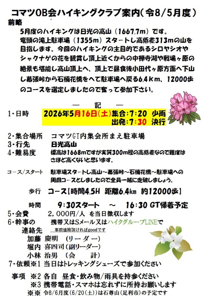 令和8年5月度のハイキングは 5/16(土) 日光市:高山(1667.7m)です。竜頭の滝上駐車場(1355m)をスタート&ゴールとして、高山に登り小田代ヶ原方面へ下山、幕張峠から石楠花橋を経て周回するコースです。皆様奮ってご参加下さい。詳細については下の案内状を参照下さい。会員の方にはLINEグループor直接案内状のハガキ郵送にてご案内しております。