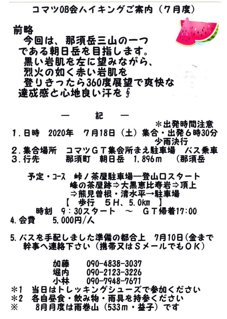 ハイキングクラブ7月度は 7/18(土) 那須町:朝日岳 1,896m です。