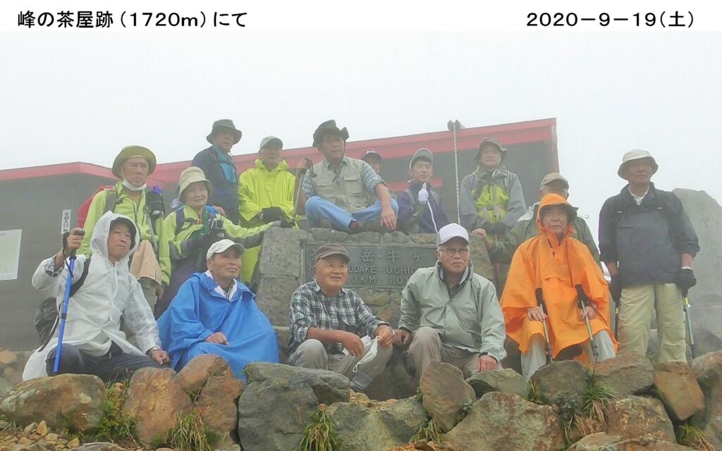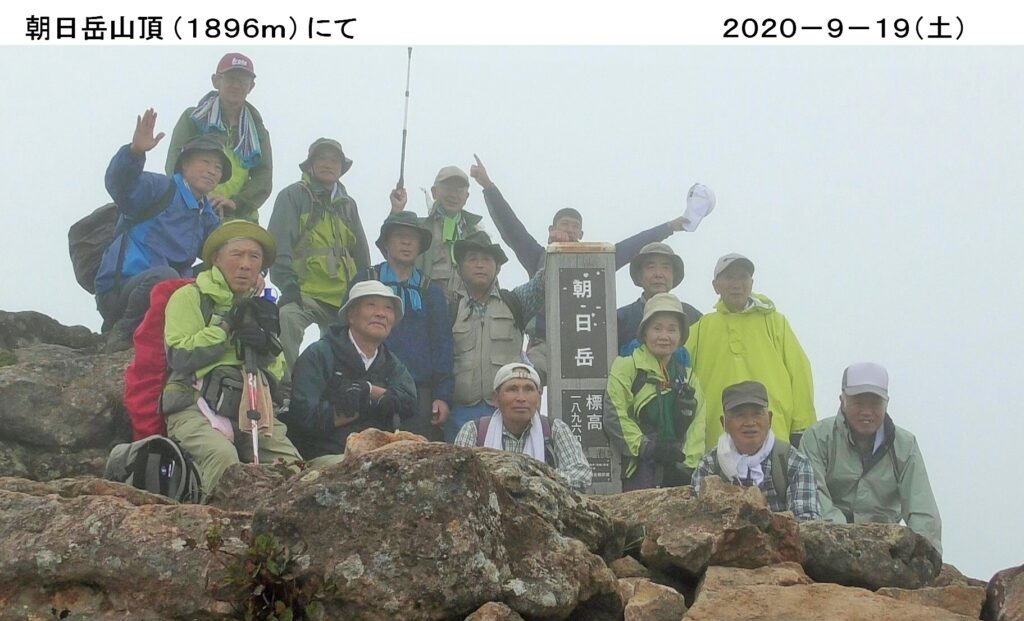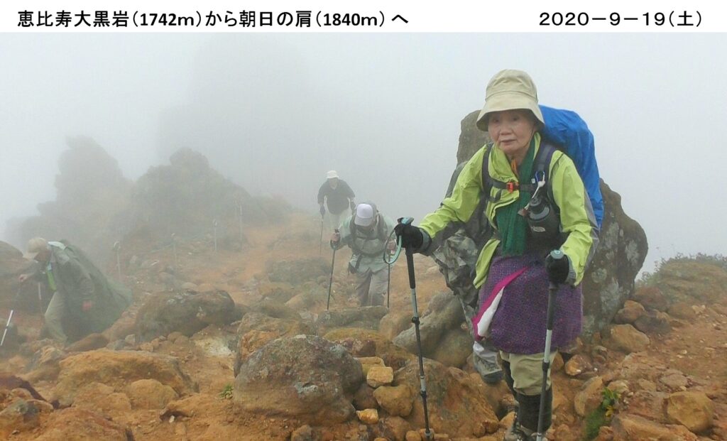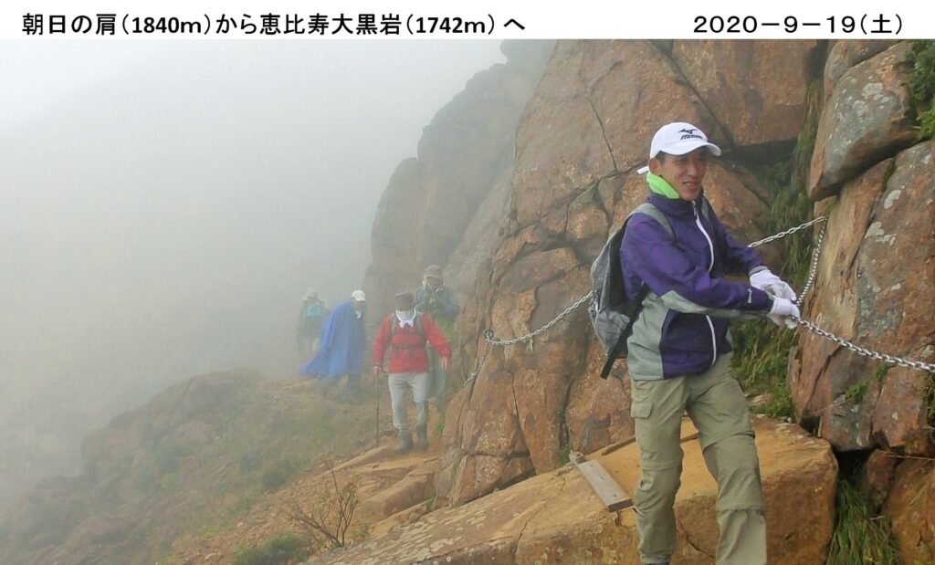 7月から再々トライとなった朝日岳を9/19(土)に登る。雨にも関わらず15人が参加、バスで那須に向かう。峠の茶屋第1駐車場をスタート。止んでいた雨が降り始め、小雨程度だが霧がかかり幻想的だ。皆色とりどりの雨具を着、元気に登る。峰の茶屋跡に着く。4連休の初日のせいか、天気が悪くてもシニアや学生の団体・親子連れなど多い。エゾリンドウの花が見頃を迎え鮮やかだ。シラタマノキの白く小さな丸い花も可愛らしい。霧に霞んで見える恵比寿大黒の奇岩を過ぎると、クサリ場が多く、峻険な岩場の登り下りだ。雨も止み、幸い風も穏やかで足元も滑らずラッキー。朝日の肩から頂上へ。視界が悪く眺望には恵まれなかったが全員無事登頂出来、記念の写真を撮る。朝日の肩で昼食し下山。岩場を登り崖をつたいスリル一杯の那須:朝日岳、約4時間のハイキングでした。