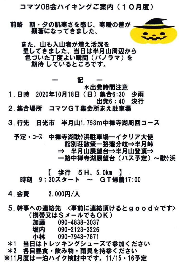 ハイキングクラブ10月度は 10/18(日) 日光市:半月山1,753m中禅寺湖周回コース です。皆様奮ってご参加下さい。詳細については下の案内状を参照下さい。会員の方には直接案内状のハガキ郵送にてご案内しております。