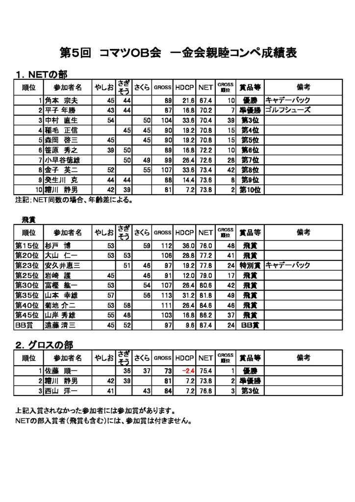 10月2日(金)に益子CCにて、第5回一金会親睦コンペを開催しました。当日は晴天に恵まれ総数51名の参加となりました。新型コロナウイルス禍での開催でしたが、感染防止のため、パーティ・表彰式は中止としました。成績表は別紙の通りです。賞品等は次回開催時(11月6日)にお渡しする予定です。今回も、ペリア方式での競技でしたので、HDCP(ハンディキャップ)の多く付いた方が上位になりました。