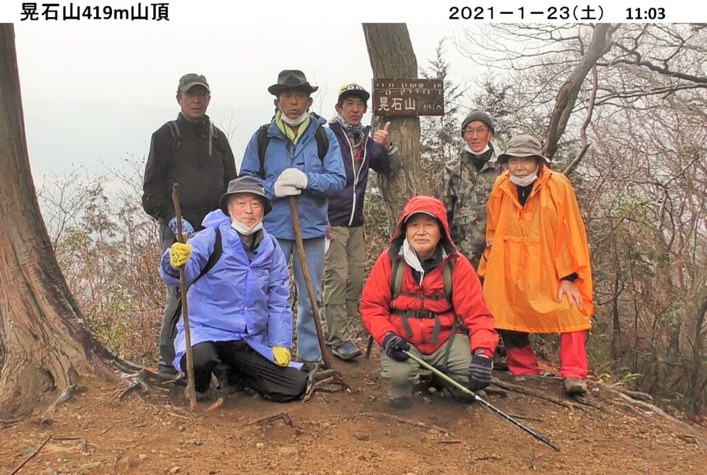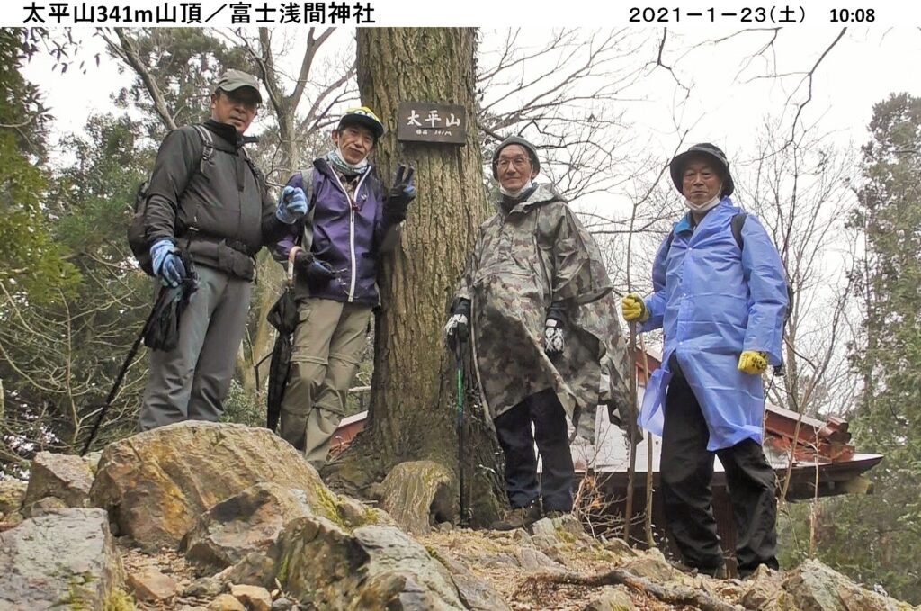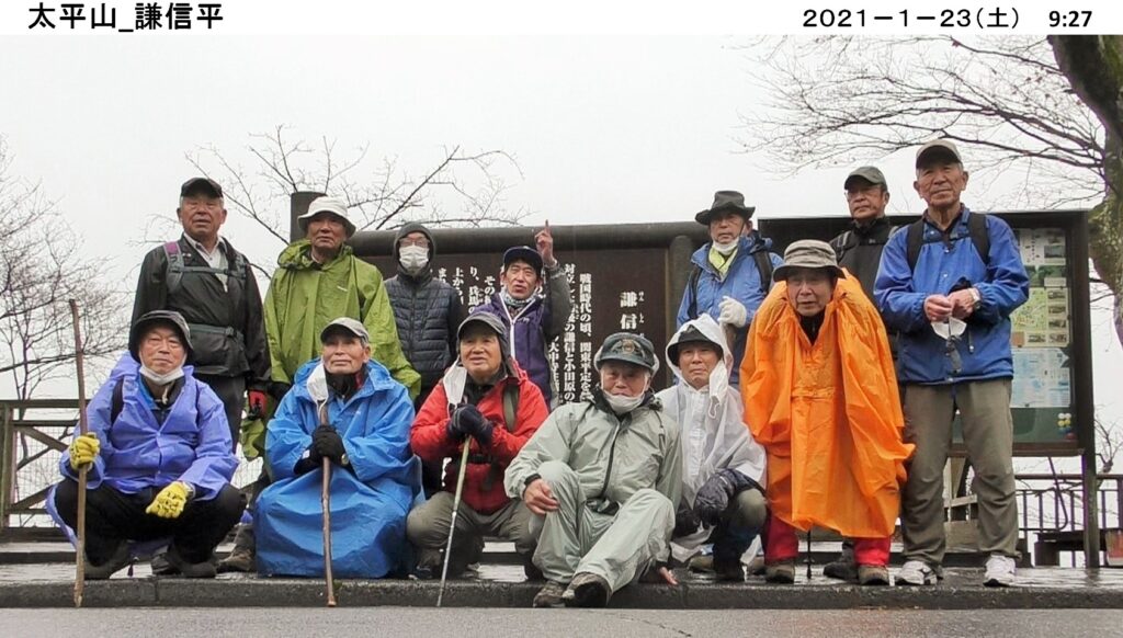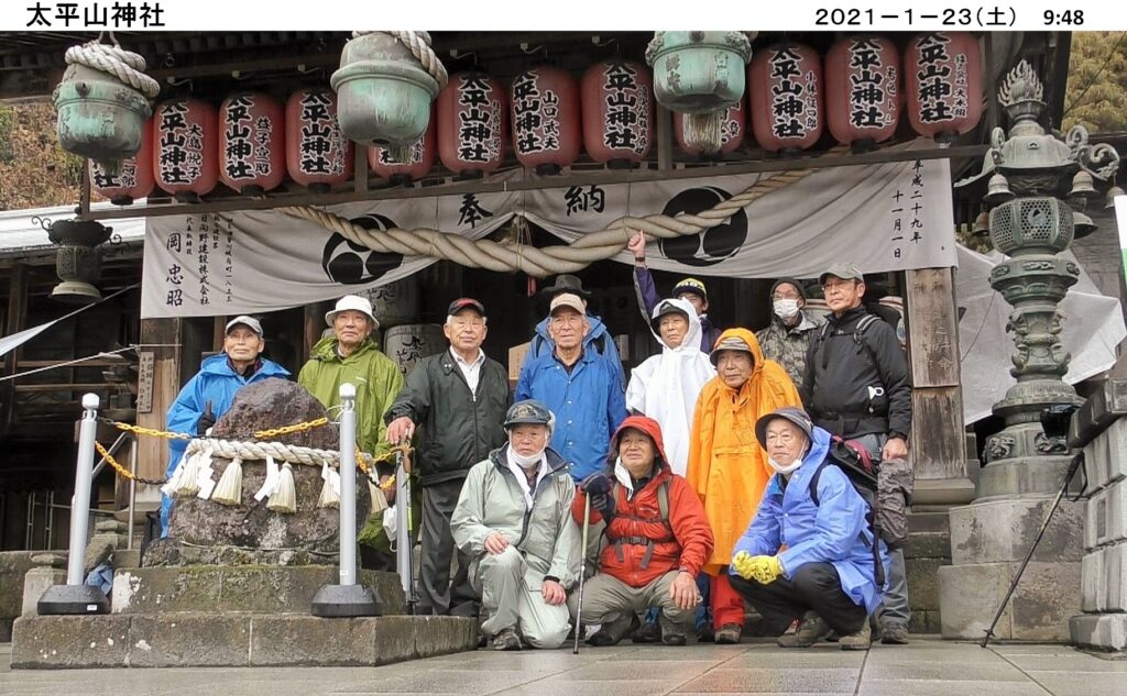 今年初めてのハイキングは 1/23(土)、栃木市の太平山・晃石山を縦走する。朝から小雨にも関わらず、コマツGTから10名、現地直行3名 計13名が参加。ポンチョや合羽等カラフルな色に身を包み大中寺をスタート。歩く早々、鮮やかなロウバイの花が出迎えてくれた。舗装の平らな道を進んだ後、登山道を登り謙信平へ。太平山神社では夫々今年の願い事を胸に参拝。ここから太平山・晃石山へと縦走。雨でぬかるみを心配したが、乾燥し埃の登山道が湿って丁度良く歩きやすい。又、寒いと思ったが、歩いて体が温まり着込んだ衣を脱ぎ調節するほど。自分のペースに合わせて山頂・尾根コース、緩やかな斜面のコースと個々に選んで進み、晃石神社で待ち合わせて昼食。帰路は、ぐみの木峠から急坂を下り大中寺へ。境内の白梅に花が沢山咲いているのを見つけ、お年玉を貰った気分でゴール。約4時間のハイキングでした。
