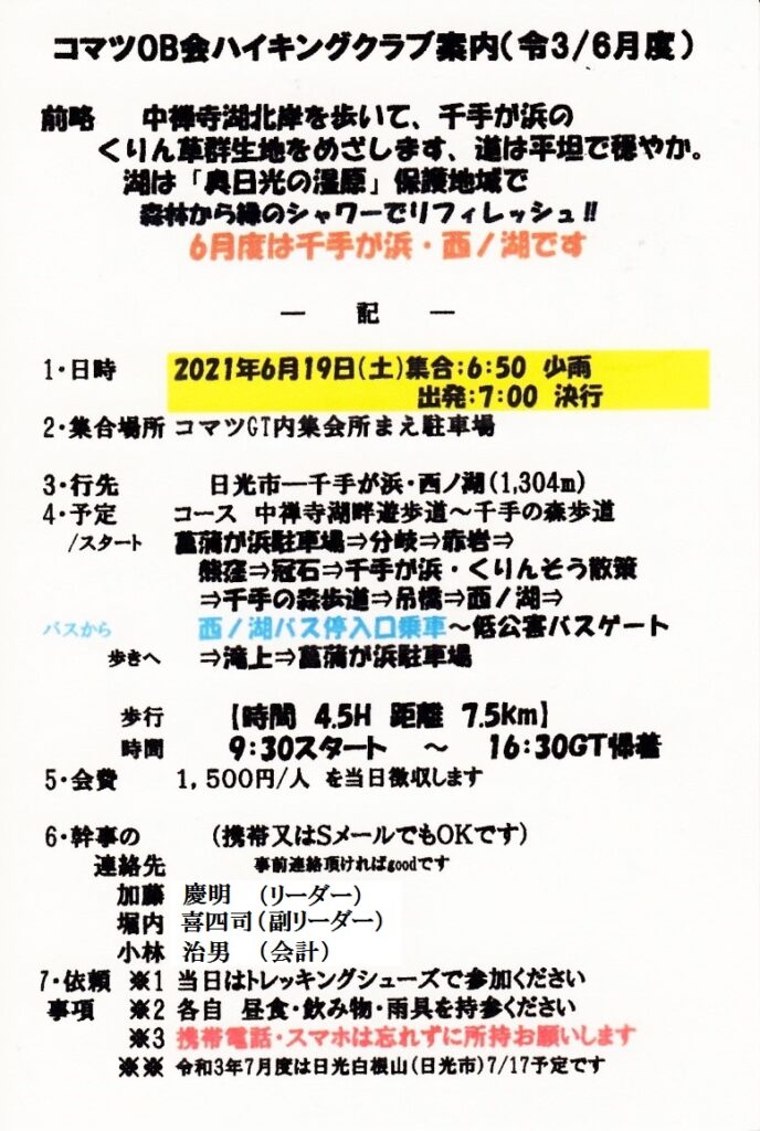 ハイキングクラブの令和3年6月度は 6/19(土) 日光市:千手ヶ浜・西ノ湖 1,304mで、up downの少ない優しいコースです。皆様奮ってご参加下さい。詳細については下の案内状を参照下さい。会員の方には直接案内状のハガキ郵送にてご案内しております。
