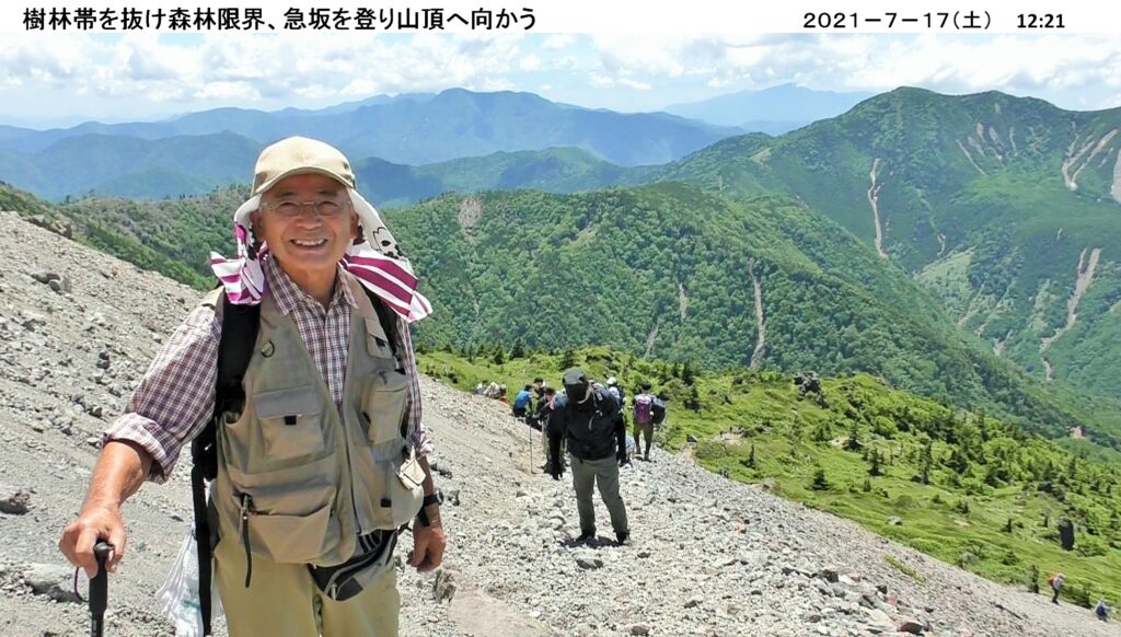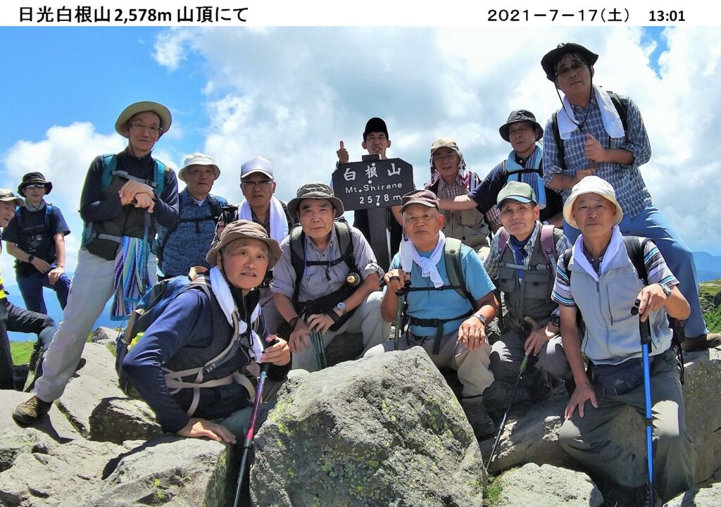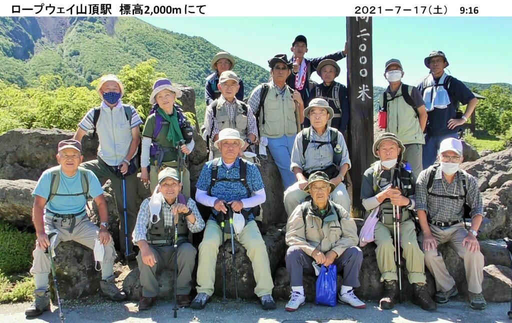 7月度のハイキングは 7/17(土) 日光白根山 2,578m へバスハイク。前日に梅雨明けし、晴天に恵まれ絶好のハイキング日和となる。16名が参加。コマツGTから丸沼高原までバス、ここからロープウェイに乗り山頂駅へ。