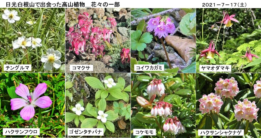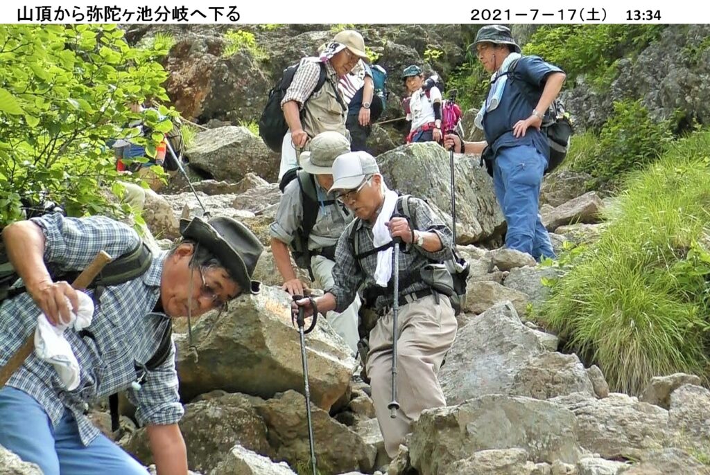 目の前に雄大な日光白根山を仰ぎ、9:20スタート。脚力に合わせ二手に分かれ、トランシーバーにより互いの状況を確認し合いながら行動する。メイングループは山頂を目指し、不動岩・大日如来と樹林帯を進んで行く。途中、長く茎を伸ばし先に細かな蕾を付けたカニコウモリの群生が続き驚く。また、登山道脇の岩穴にヒカリゴケを見つけ、発光する幻想的な色に感動。樹林帯から森林限界に移る絶好の木蔭で早めの昼食。山で食べるおにぎりの味は、また格別。視界が開け目の前に白根山が現れ、急坂を登っていく。大小様々な岩や石のガレ場が続き、足が取られ歩きにくい。周囲の眺望は最高、残雪の山々も見える。絶景に励まされながら、皆元気に登頂。山頂から見る男体山や中禅寺湖、足下に望む五色沼も奇麗だ。弥陀ヶ池分岐へ下る。岩がゴロゴロして歩きにくい。途中休憩を取り、ハクサンシャクナゲなど高山植物の花々に癒されながら、細心の注意を払い下っていく。弥陀ヶ池分岐から七色平分岐を左折、大日如来へ。登って来た道を下り、山頂駅15:50全員無事ゴール。約6時間半の充実したハイキングでした。