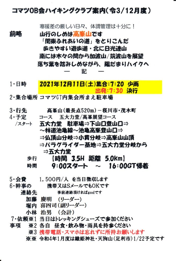 ハイキングクラブR3/12月度は 12/11(土) 茨城県桜川市・栃木県茂木町の県境に位置する高峯(別名 龍神山)519.6mです。五大力堂をスタートし、林道池亀線で池亀高峯登山口へ。関東ふれあいの道を登り尾根に出、高峯山頂・パラグライダー離陸場と縦走、五大力堂分岐から直接下りゴールするコースです。皆様奮ってご参加下さい。詳細については下の案内状を参照下さい。会員の方には直接案内状のハガキ郵送にてご案内しております。