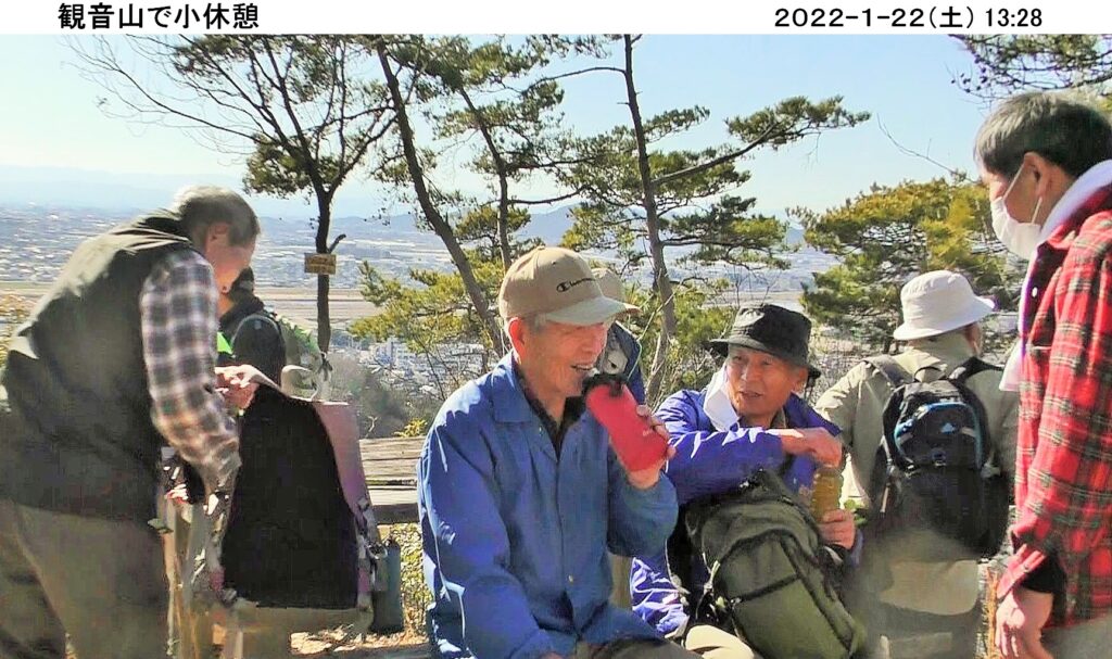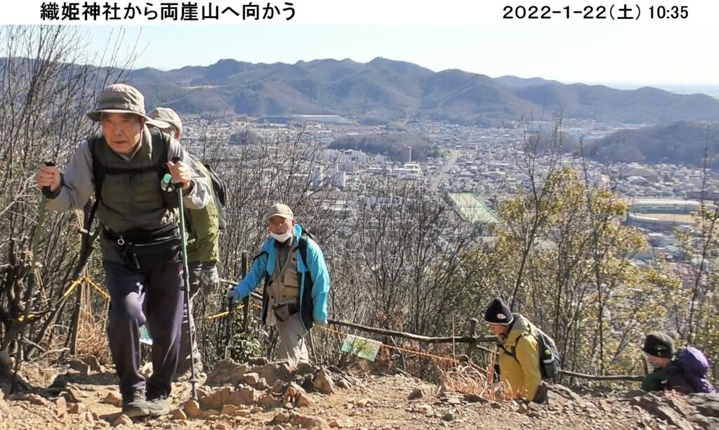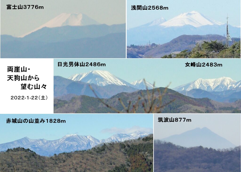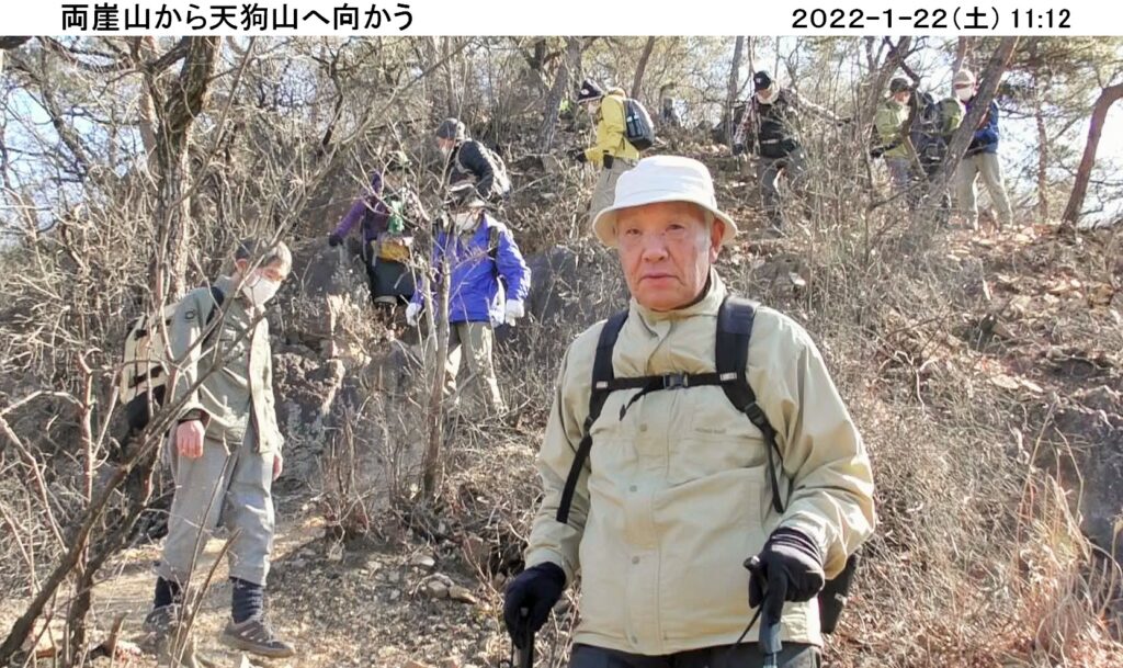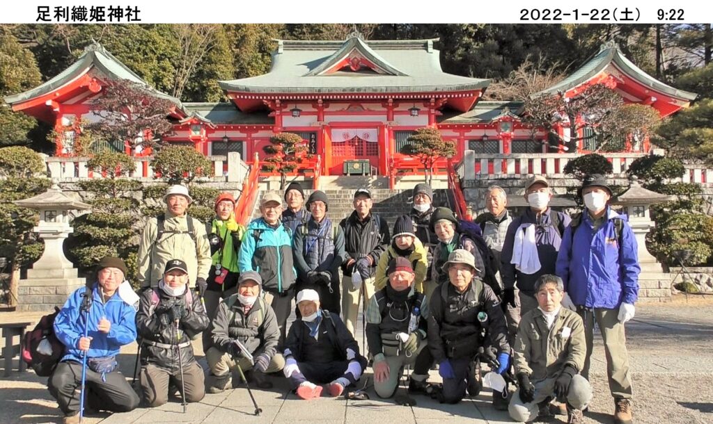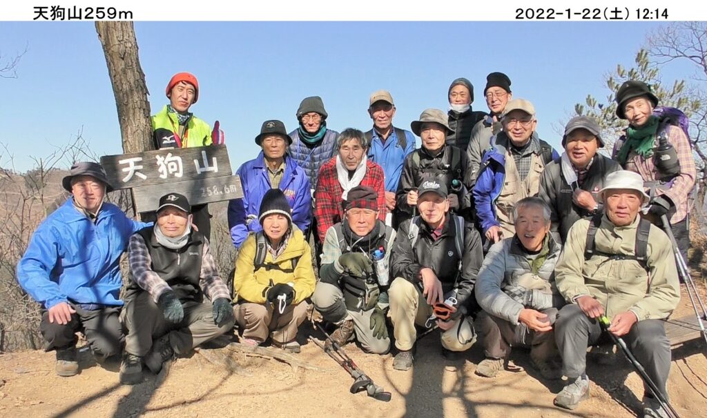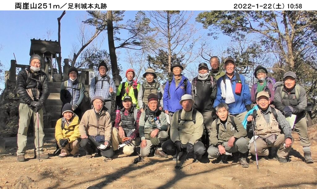 令和4年初めてのハイキングは1/22(土)、足利市の両崖山・天狗山。風も無く良く晴れ、絶好のハイキング日和。コマツGTから16名、現地直行3名計19名の参加。
