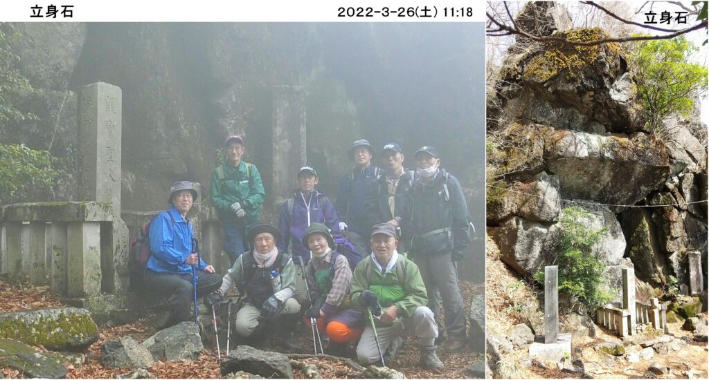 桜川市_薬王院第3駐車場を8:37スタート。鳴き始めたばかりのウグイスの声を聴きながら、なだらかな坂道を登っていく。鬼ヶ作林道に出合、この先から名物の約800段の急な階段になる。皆、汗をかきながら元気に登る。登り切りコースを左折、5分ほど登ると坊主山(太郎山)710m山頂10:17。風の音は大きいが、木等が風よけになっているのか体にはあまり感じない。御幸ヶ原へ向かう。“大石重ね”から筑波山自然研究路のコースと一緒になり、ここから男体山を周回する。3/22(火)に降った雪を心配したが、残っておらずホッとする。御幸ヶ原はガスっており、風も殆んど無く、幻想的だ。工事中で、コマツのパワーショベルPC58UUが活躍していた。男体山南面にある巨石“立身石”へ11:13。パワースポットで有名との事だが、見上げるとその迫力に圧倒される。滑落し修復工事を終えたばかりの自然研究路を進む。カタクリが多く見られ、薄紫色の花も咲き始めていた。途中の東屋で昼食。椅子も整備され、自然の中での食事は美味しい。