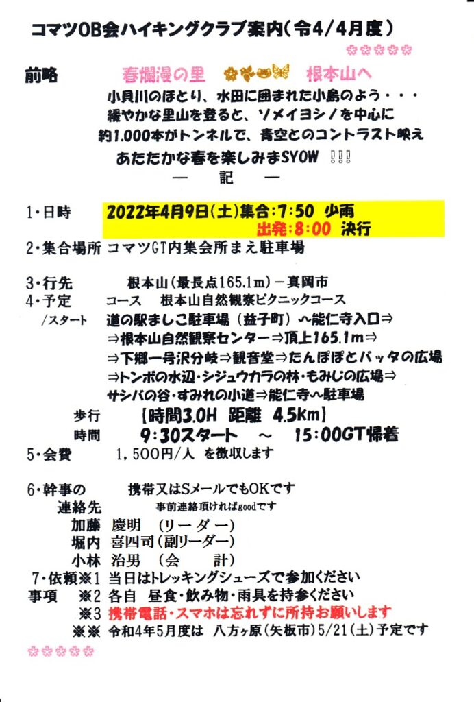 ハイキングクラブR4/4月度は 4/9(土) 根本山165.1m(真岡市)です。道の駅ましこ駐車場(益子町)をスタート&ゴールとし、根本山(真岡市)を周回する足にやさしいコースです。山を彩る桜の花に期待し、すみれの花咲く小道を歩いて見ましょう。会員の方には直接案内状のハガキ郵送にてご案内しております。