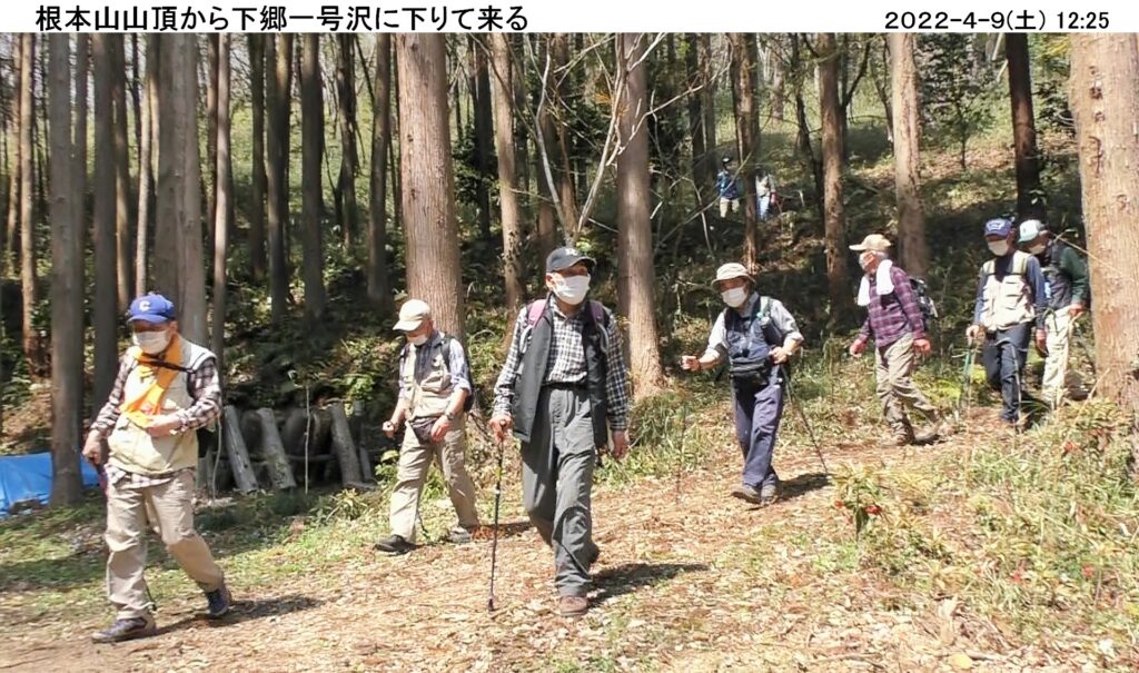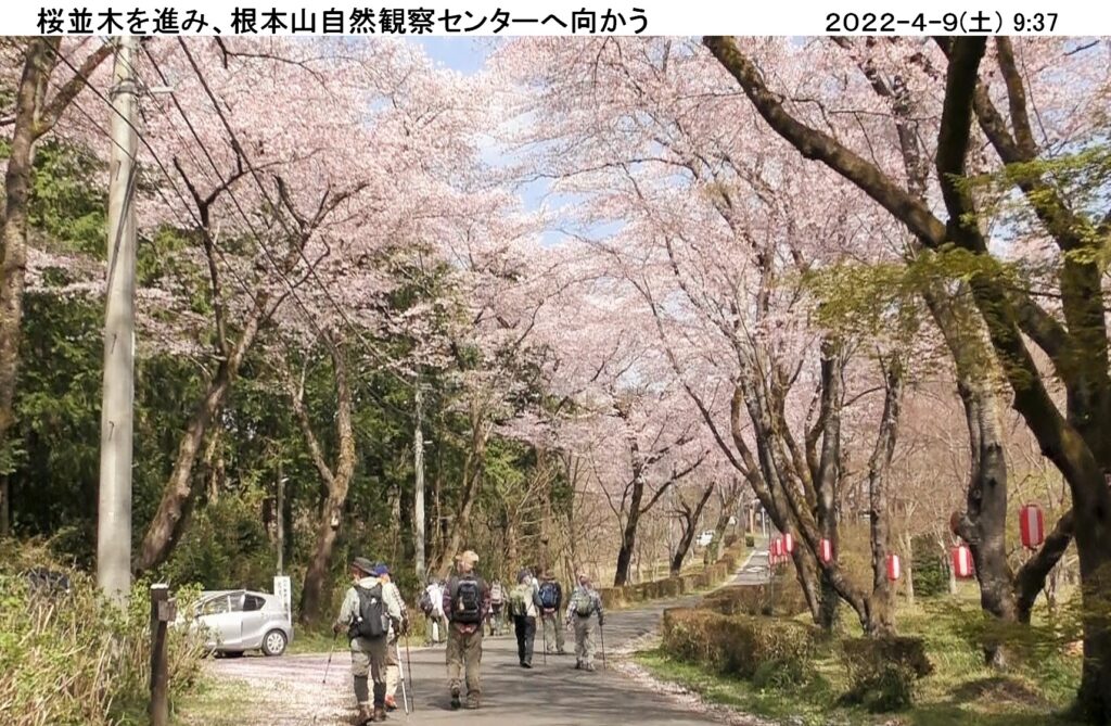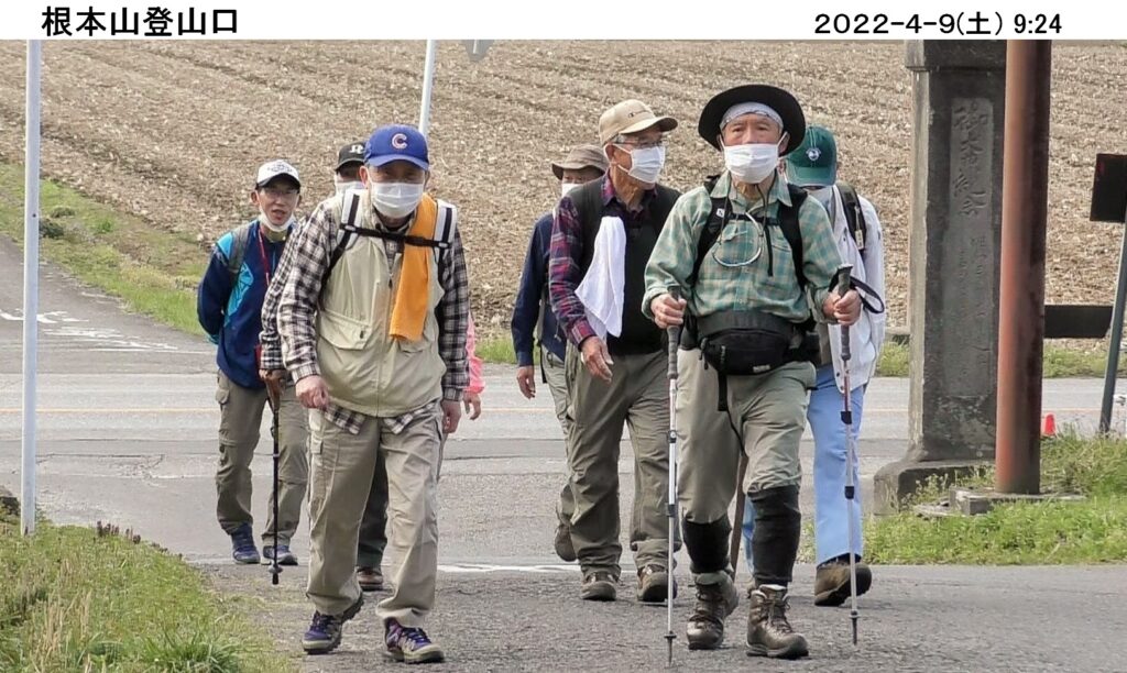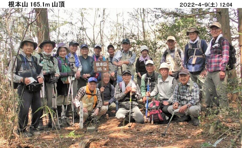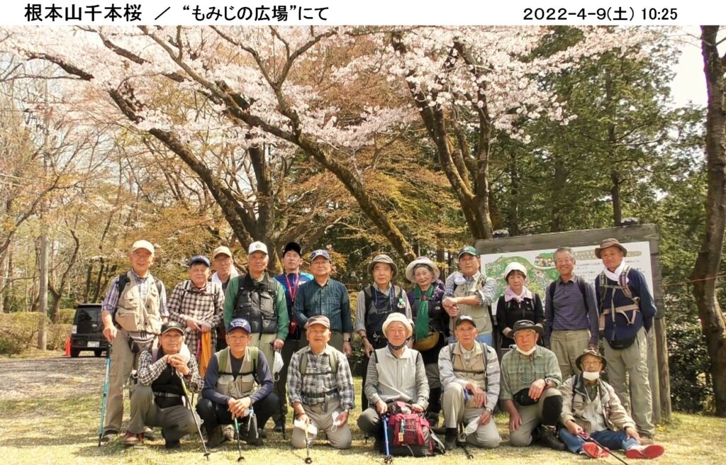 令和4年4月度のハイキングは4/9(土)、真岡市の根本山165.1m。暖かで穏やかな天気に恵まれ、コマツGTから12名、現地直行7名計19名が集まる。2年半ぶりに元気に参加してくれた野上さんの姿も見え、一緒に歩けるのは嬉しい。