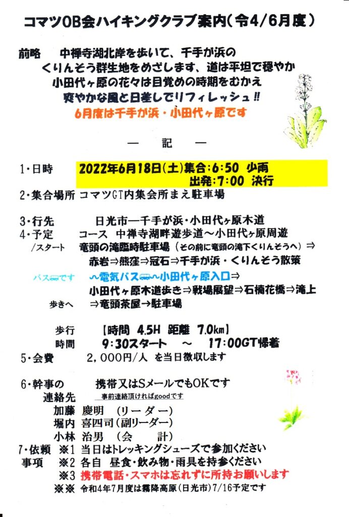 ハイキングクラブR4/6月度は 6/18(土) 千手ヶ浜・小田代ヶ原(日光市)です。竜頭ノ滝臨時駐車場をスタート&ゴールとし、中禅寺湖北岸を歩き、千手ヶ浜のクリンソウ群生地を目指します。千手ヶ浜からは電気バスで小田代ヶ原に移動。目覚めの時期を迎えた花々と、爽やかな天候に期待し、小田代ヶ原を周遊します。平坦で歩きやすいコースですので皆様奮ってご参加下さい。詳細については下の案内状を参照下さい。会員の方には直接案内状のハガキ郵送にてご案内しております。