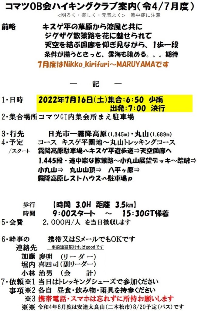 ハイキングクラブR4/7月度は 7/16(土) 霧降高原キスゲ平園地・丸山(日光市)です。霧降高原駐車場(1345m)をスタート&ゴールとし、キスゲ平園地の花々や景色を眺めながら天空回廊(1445段)orジグザグ散策路を進みます。小丸山(1601m)・丸山(1689m)と周遊し、八平ヶ原を抜けて一周するコースです。標高差も少なく、花と眺望が期待出来るコースですので皆様奮ってご参加下さい。詳細については下の案内状を参照下さい。会員の方には直接案内状のハガキ郵送にてご案内しております。