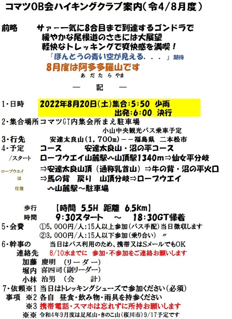 ハイキングクラブR4/8月度は 8/20(土) 安達太良山1,700m(福島県二本松市)です。あだたら山ロープウェイを利用しゴンドラで一気に8合目に到達。山頂駅から尾根を行き、安達太良山山頂、沼の平火口と進みます。復路もロープウェイを利用し下山。360度の大パノラマ、絶景が期待出来るコースですので皆様奮ってご参加下さい。詳細については下の案内状を参照下さい。会員の方には直接案内状のハガキ郵送にてご案内しております。