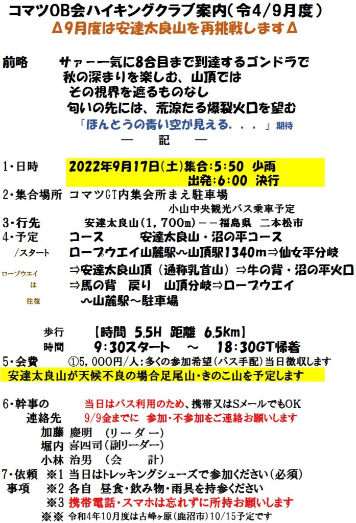 ハイキングクラブR4/9月度は 9/17(土) 安達太良山1,700m(福島県二本松市) に再挑戦です。