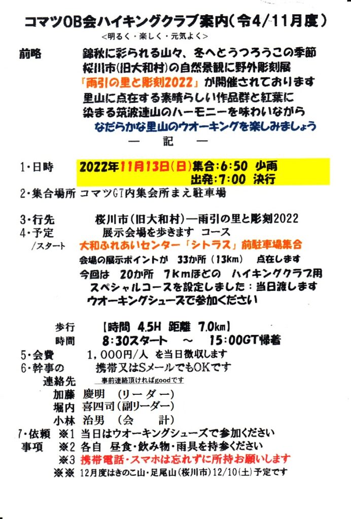 ハイキングクラブR4/11月度は 11/13(日) 桜川市(旧大和村)の「雨引の里と彫刻2022」 です。紅葉に染まる筑波連山をバックに、麓に点在する素晴らしい芸術の作品群を鑑賞しながら、なだらかな里山のウォーキングを楽しみましょう。詳細については下の案内状を参照下さい(作品のごく一部も添付しました)。会員の方には直接案内状のハガキ郵送にてご案内しております。(11月度は一泊ハイクを予定しておりましたが、コロナ禍により予定を変更したのでご了承願います。)