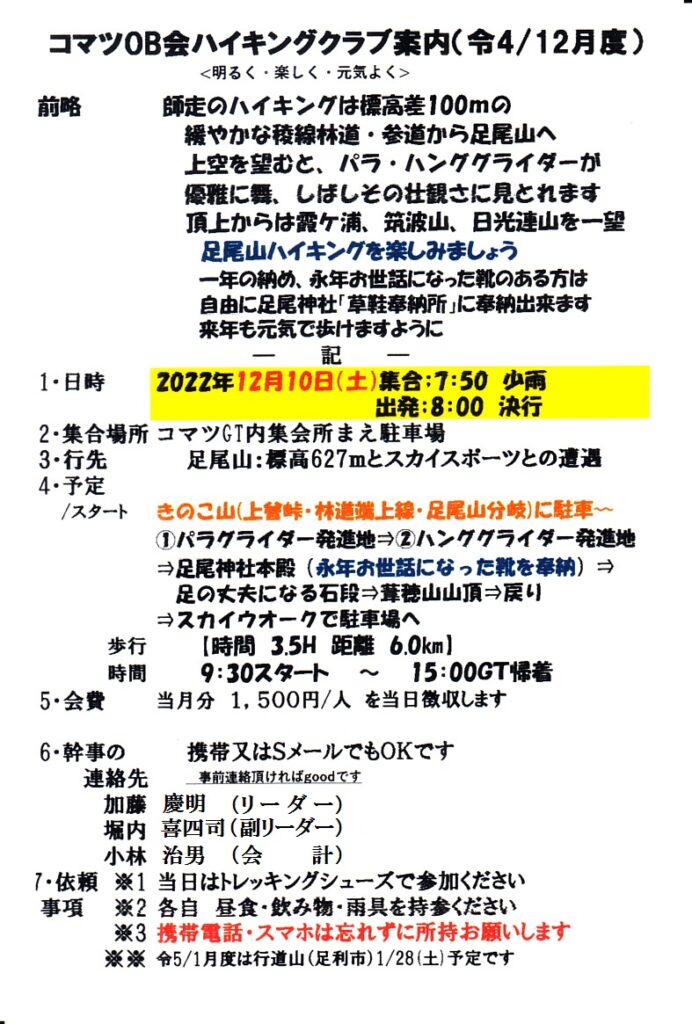 ハイキングクラブR4/12月度は、一年を締めくくり 12/10(土) 桜川市_足尾山・きのこ山 です。スタート地点のきのこ山パラグライダー離陸場まで車で登り、筑波連山北部の稜線林道を足尾山まで縦走します。山頂下には「草鞋奉納所」の有る足尾神社。永年お世話になった靴の有る方は是非お持ち頂き、来年以降も元気で歩ける様奉納頂ければと思います。神社から自然味溢れる石段を登ると、展望抜群の足尾山627m山頂、絶景が待ってます。皆様奮ってご参加下さい。詳細については下の案内状を参照下さい。会員の方には直接案内状のハガキ郵送にてご案内しております。