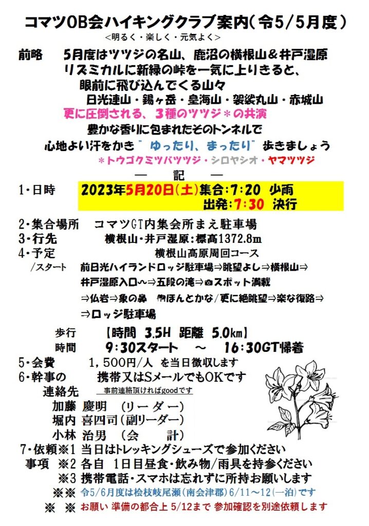 ハイキングクラブの令和5年5月度は 5/20(土) 鹿沼市:横根山・井戸湿原です。前日光ハイランドロッジ駐車場(標高1298m)をスタート&ゴールとし、ツツジの名山 横根山(1372.8m)・井戸湿原・五段の滝・象の鼻と周回、眺望も素晴らしいコースです。皆様奮ってご参加下さい。詳細については下の案内状を参照下さい。会員の方にはLINEグループor直接案内状のハガキ郵送にてご案内しております。(会員でスマホをお持ちの方はLINEグループ「コマツOB会ハイククラブ」の友だち加入をお待ちしております。)