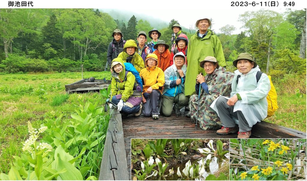令和5年6月度は四年ぶりのバス一泊ハイキング、6/11(日)~12(月) 尾瀬:燧裏林道。梅雨空の中、13名が参加。コマツGTを4:50に出発、檜枝岐村から入り御池駐車場に9:08到着。