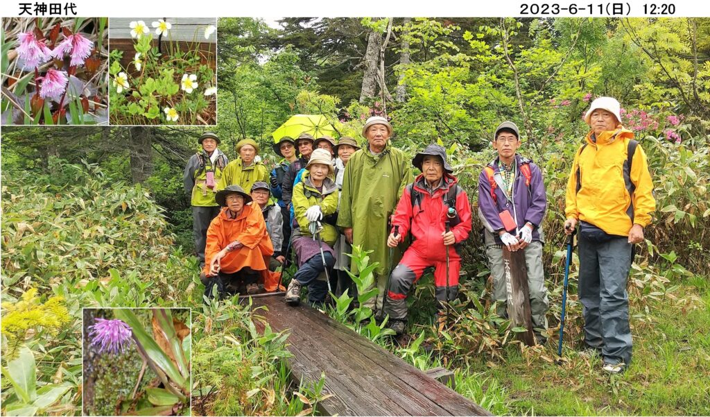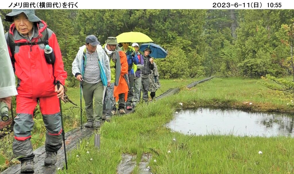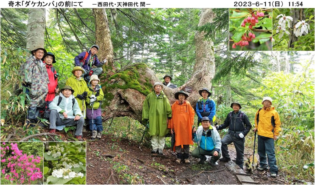 雨止まず、皆 合羽・ポンチョ・傘等色とりどりの装備で9:35スタート。広い木道を5分ほど歩くと、御池田代。咲き始めた白いコバイケイソウが出迎えてくれた。湿原は黄色のリュウキンカが見頃で素晴らしい。更に進むと木道の両側にミズバショウが続く。鮮やかな葉の緑に白い花は優雅であり、正に尾瀬の主役だ。足元には小さな、チングルマ・ヒメシャクナゲ・イワカガミ・ショウジョウバカマ等の花々が続き、皆 花を眺めながら、雨も苦にならずに進む。朝ドラ「らんまん」で話題となったミツバオウレンも可憐で良い。田代間の林の中も、オオカメノキの白色、ツツジの赤色の花が咲き楽しませてくれる。ラクダの姿に似たダケカンバの古い奇木にも出会い、記念写真をパチリ。姫田代・上田代・ノメリ田代・西田代と湿原を進み、天神田代で折り返し、14:07無事御池駐車場にゴール。約4時間半の納得のハイキングでした。その日は檜枝岐村泊。イワナの刺身やサンショウウオの天ぷらで美味い地酒も堪能。2次会では美味しい高級ウィスキーの差入れもあり、大いに飲み、満足の一日でした。