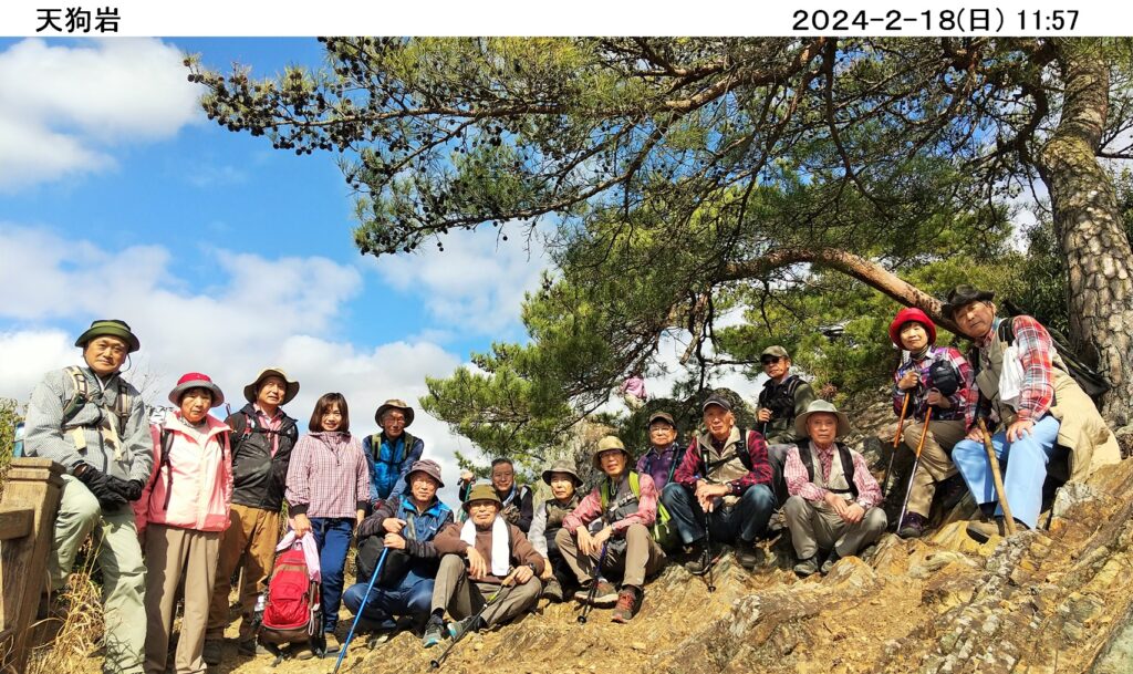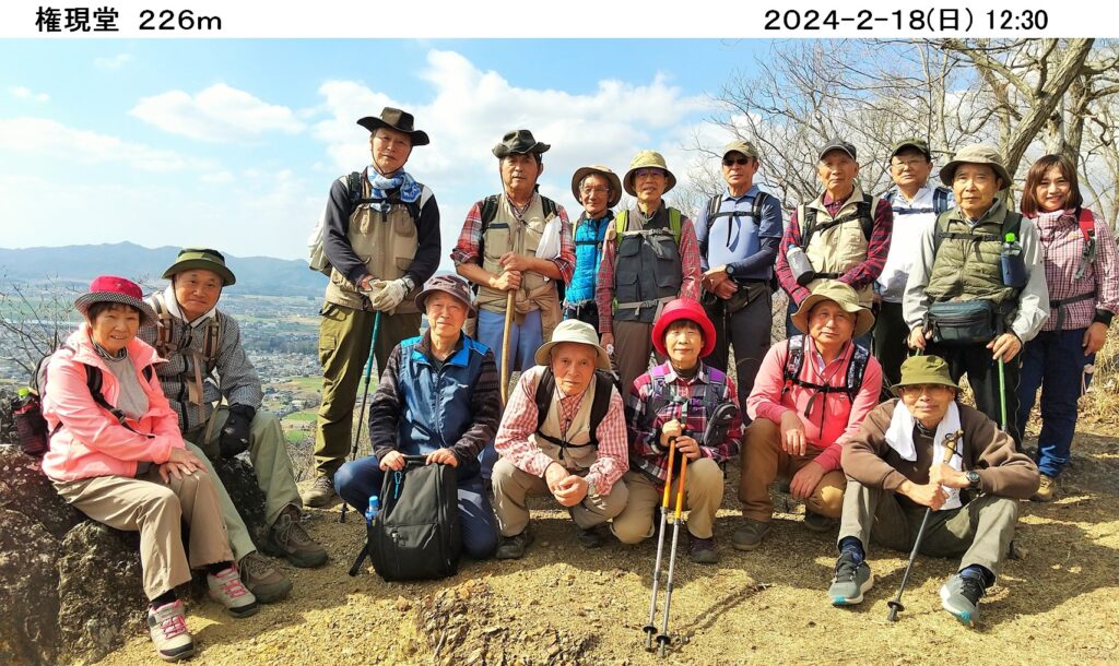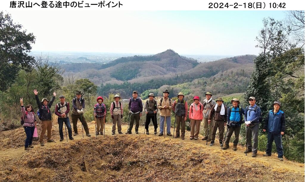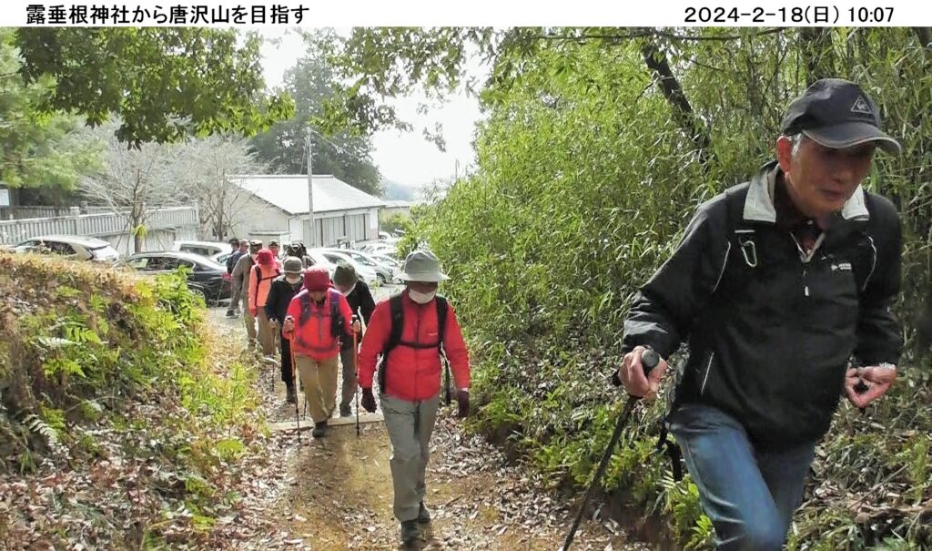 令和6年2月度ハイキングは2/18(日)、佐野の唐沢山県立自然公園周遊ハイキングコ-スだ。16名が参加し、朝10時、露垂根神社前を出発し東側尾根へ。緩い上り坂は厚い落ち葉を踏みしめながら気持ち良く歩きやすい。気持ち良く進んでいるうちに唐沢山山頂に。唐沢山神社の境内には立札(唐沢山241m)と八百尺の石碑も建てられていた。唐沢山神社は国指定史跡唐沢山城本丸跡に建立され、周りには多くの史跡があり、駐車場等の観光施設も整備され観光客が大勢集まっていた。特にバイクの数が多いのにはびっくり、若者たちにも人気があるのだと感じた。天狗岩で昼食を取り西側尾根へ。尾根筋の随所に絶景の見所があり飽きることがない、また高速北関東道のトンネルが下を通っている山の上(権現堂)から見る景色も初めてで良かった。下りに入ると大きな石は無かったが、落ち葉で隠れた石が多く、比較的短い距離だったが下りが苦手な自分には少し辛かった。天気は良く予報では16度と季節はずれの暖かさで、とても気持ちよく歩けた。今回のコ-スは四季折々の見所も多いようで いつ行っても楽しめる良いコ-スだと思いました。ありがとうございました。