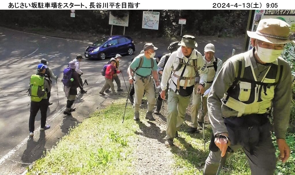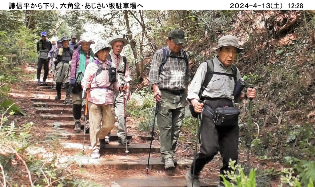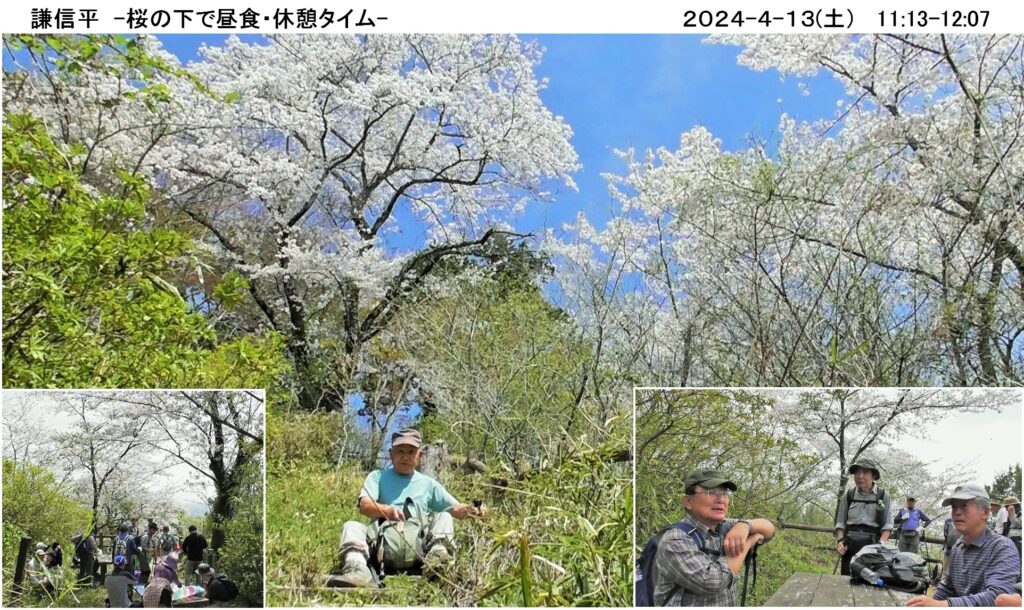 朝9:04 あじさい坂駐車場を出発し、長谷川平→太平山神社→富士浅間神社・太平山341m→ぐみの木峠付近経由→謙信平→あじさい坂駐車場までの5.6km、上り271m、約4時間のハイキングでした。皆さん健脚揃いで物足りなさを感じる方も居りましたが、満開の桜を観ながらのハイキングは爽快でした。ほぼ無風で天気も良く、謙信平では桜吹雪を浴びながらのお弁当休憩でした。又やや霞んだ遥か彼方に、筑波山を望む事も出来ました。週末と言うこともあり、お花見のお客さんで溢れて居ました。謙信平の地名の由来は、室町時代後期に越後の上杉謙信が兵馬の訓練を行った事から命名されたと言われています。私はスポット参加でしたが、クラブ員の皆様に暖かく迎えて頂き、感謝々々の1日でした。大変、有難うございました。