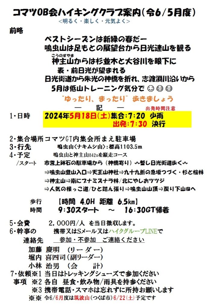 令和6年5月度のハイキングは 5/18(土) 日光市:鳴虫山(ナキムシヤマ)1103.5mです。二荒山神橋近くの市営上鉢石駐車場(上鉢石町1101-2)をスタート&ゴールとし、鳴虫山登山口(志渡淵川)から神主山(コウノスヤマ)842m、鳴虫山と縦走し折り返すコースです。皆様奮ってご参加下さい。詳細については下の案内状を参照下さい。会員の方にはLINEグループor直接案内状のハガキ郵送にてご案内しております。(会員でスマホをお持ちの方はLINEグループ「コマツOB会ハイククラブ」の友だち加入をお待ちしております。)