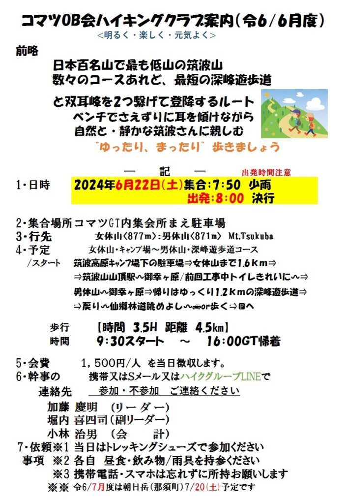 令和6年6月度のハイキングは 6/22(土) 桜川市&つくば市:筑波山です。筑波高原キャンプ場下の駐車場をスタート&ゴールとし、キャンプ場コースを登り女体山877mへ、御幸ヶ原へ下り男体山871mへ、再び御幸ヶ原から深峰歩道を下り駐車場へ周回するコースです。皆様奮ってご参加下さい。詳細については下の案内状を参照下さい。会員の方にはLINEグループor直接案内状のハガキ郵送にてご案内しております。(会員でスマホをお持ちの方はLINEグループ「コマツOBハイククラブ」の友だち加入をお待ちしております。)