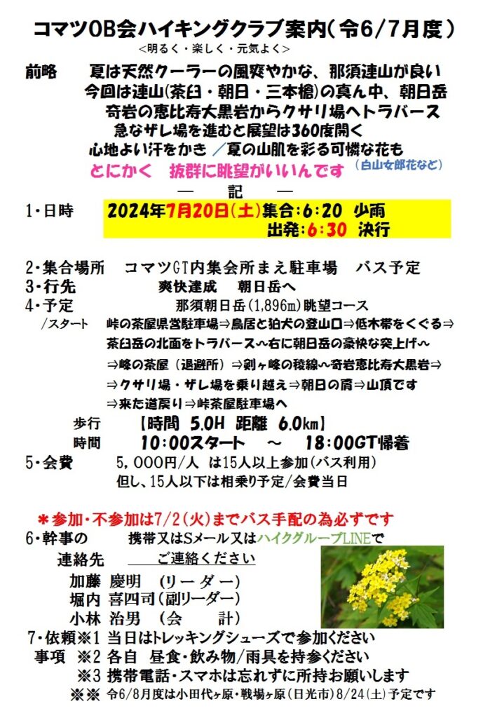 ハイキングクラブの令和6年7月度は 7/20(土) 現地まで往復楽々なバスハイク 那須_朝日岳1896mです。峠の茶屋県営駐車場(標高1473m)をスタート&ゴールとし、峰の茶屋跡避難小屋・恵比寿大黒・朝日の肩と進み朝日岳山頂で折り返すコースです。皆様奮ってご参加下さい。コマツGT集合6:20と早いです。参加・不参加はバス手配のため必ず7/2(火)までに連絡下さい(参加15名以上=バス利用、15名未満=車相乗り予定)。詳細については下の案内状を参照下さい。会員の方にはLINEグループor直接案内状のハガキ郵送にてご案内しております。(会員でスマホをお持ちの方はLINEグループ「コマツOB会ハイククラブ」の友だち加入をお待ちしております。)