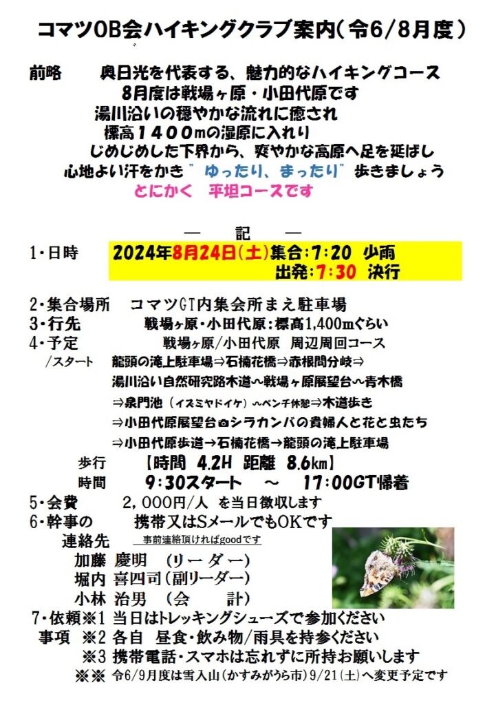 令和6年8月度のハイキングは 8/24(土) 日光市:戦場ヶ原・小田代原です。竜頭の滝上駐車場をスタート&ゴールとし、湯川沿いに北上、戦場ヶ原を歩き泉門池(イズミヤドイケ)で折り返し、小田代原を歩き周回するコースです。皆様奮ってご参加下さい。詳細については下の案内状を参照下さい。会員の方にはLINEグループor直接案内状のハガキ郵送にてご案内しております。(会員でスマホをお持ちの方はLINEグループ「コマツOBハイククラブ」の友だち加入をお待ちしております。)