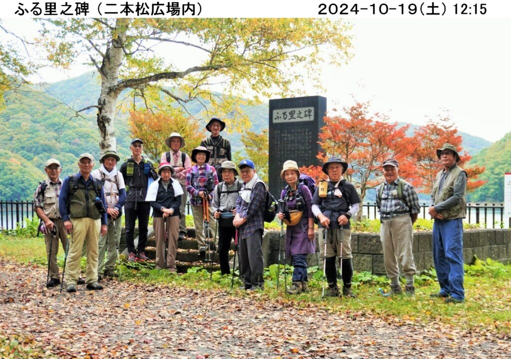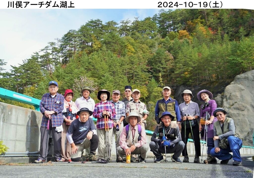 今月のハイキングは 10/19(土) 紅葉の川俣ダム湖畔コ-スです。当日の小山は朝から小雨が降り天候が気がかりだったが、朝7時にGT集合11名が3台の車に便乗して出発。約130km先の川俣ダム駐車場まで2h30mで走破しほぼ予定通りに到着。直行組3名と合流し総勢14名、心配した天候も早々に回復し晴天となった。