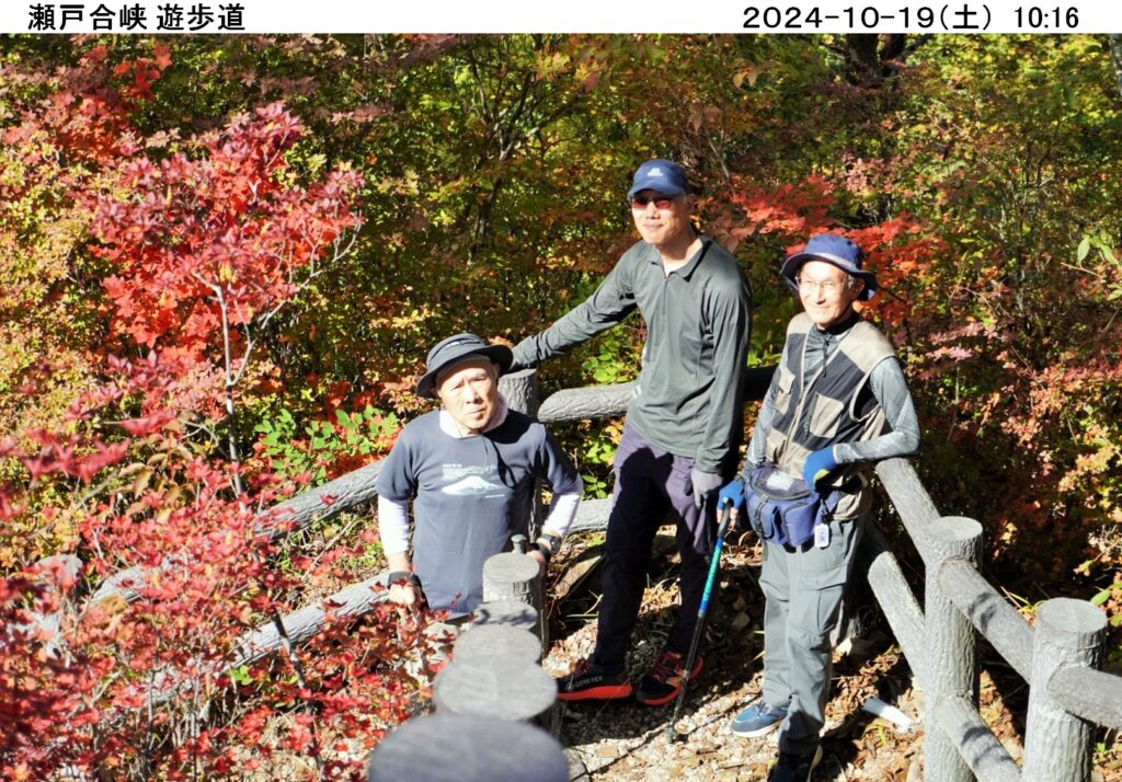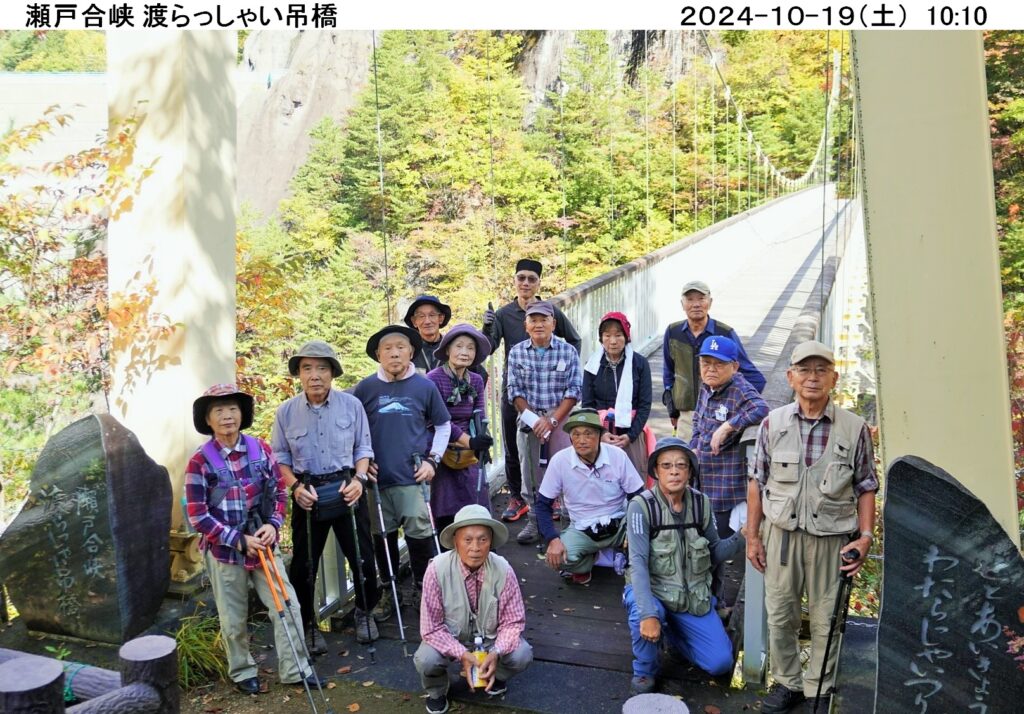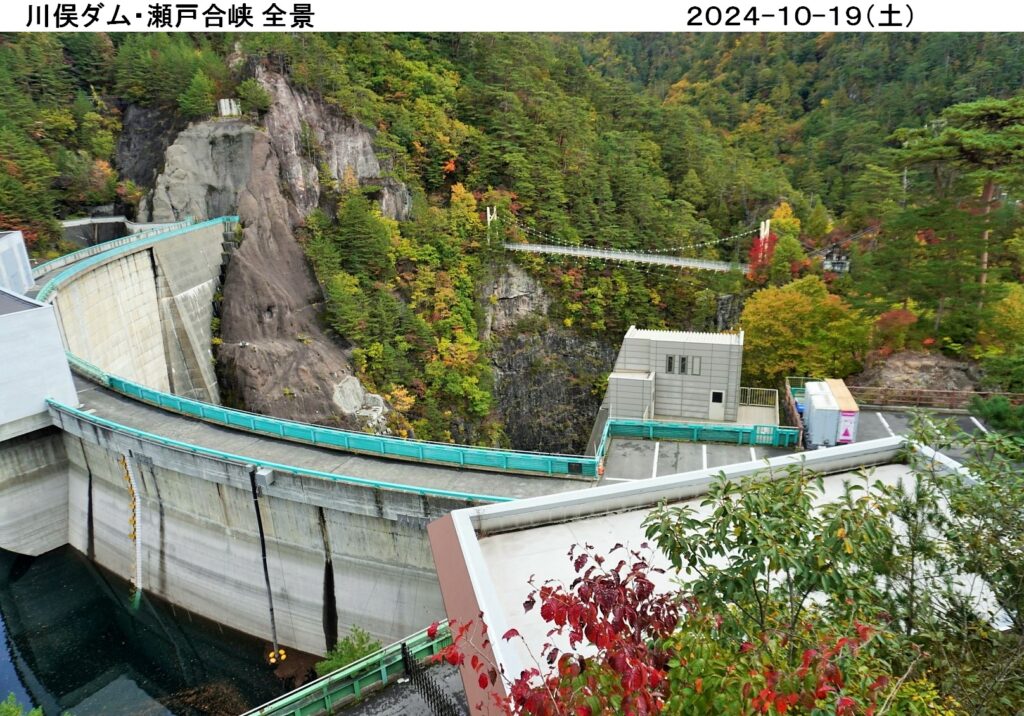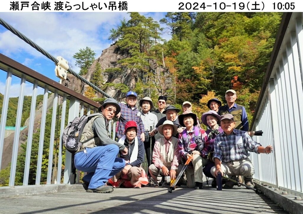 10時に駐車場をスタ-ト、早速山々の紅葉が目に飛び込んで来、眼下のダム湖面に紅葉が映り実に綺麗。この先の瀬戸合峡の渓谷にも期待し約460段の階段を昇降し四阿へ。ここからの日光連山は勇壮、さらに天使の鐘を経由し渡らっしゃい吊橋へ。眼下に望む渓谷も紅葉が始まり美しく感動的、各人がスマホシャッタ-を何枚も切り紅葉景色をgetし満足そう。吊橋の揺れが苦手な人には紅葉の峡谷や記念の集合写真も参加出来ずちょっと気の毒でした。この後、戻ってダム堤防堰堤へ、ここからも吊橋と紅葉の峡谷全体が望め感動的でした。さらに川俣ダム資料室を見学、噂のダムカ-ドをgetし模型や写真の展示品を見て見識を広めました。ここまで約1h30m程かけて川俣ダムの紅葉等を堪能し、お腹が空いたので昼食場(二本松広場)へと移動、近くの平家塚駐車場へ車を移動し、湖畔コ-スを歩いて12時丁度に二本松広場に到着。湖面や紅葉の山並みを見ながら昼食を、景色抜群、空気は美味い、ご飯も美味い。大満足の昼食を済ませ、雲行きが怪しくなって来たので急いでコ-スをショ-トカットし駐車場へ戻る。