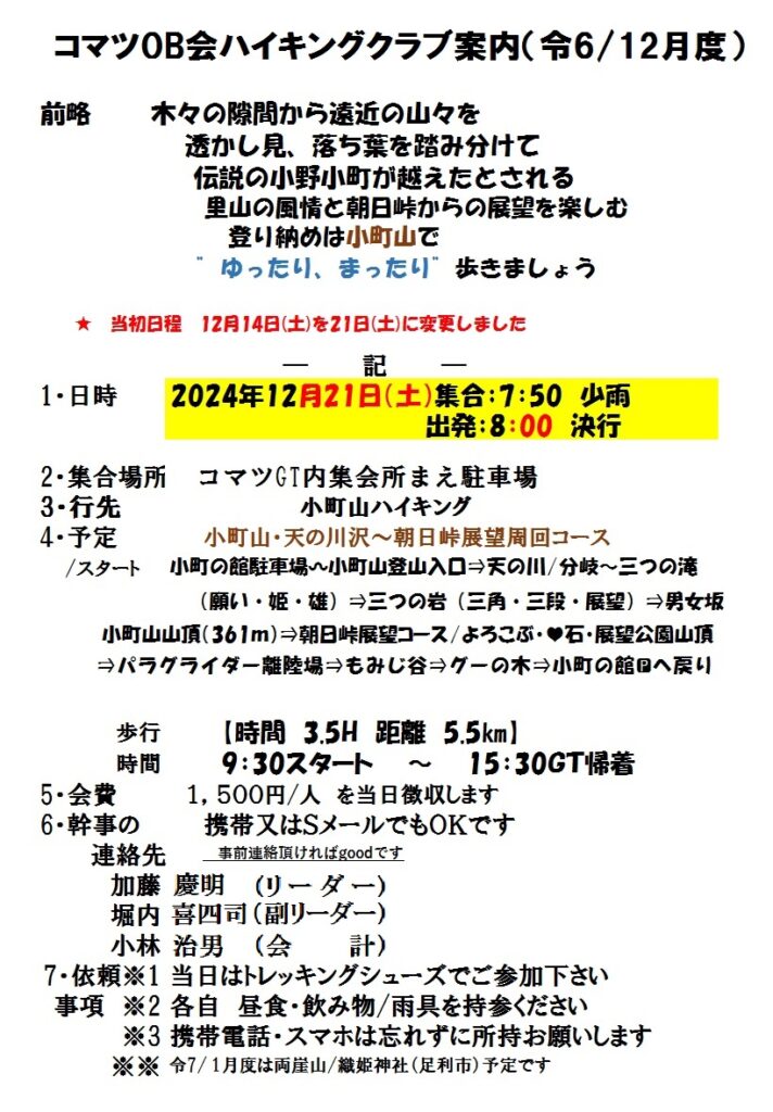 ハイキングクラブの令和6年12月度は 12/21(土) 土浦市:小町山361m です。[当初日程12/14(土)から21(土)に変更したのでご注意下さい]