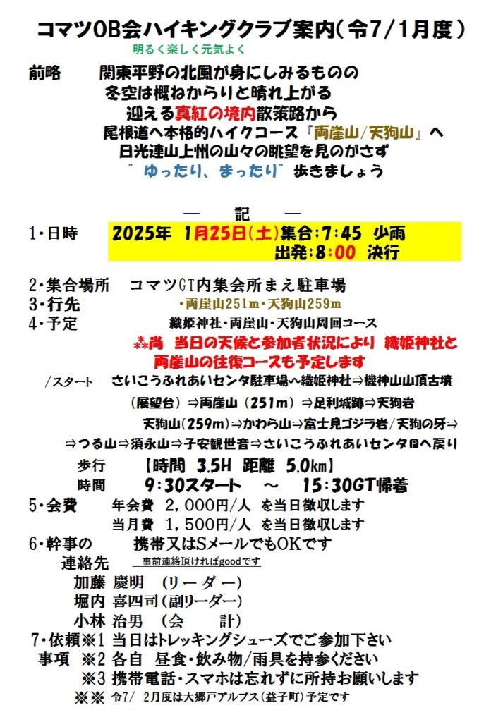 令和7年最初のハイキングは 1/25(土) 足利市:織姫神社・両崖山251mです。さいこうふれあいセンターをスタート&ゴールとし、織姫神社に参詣、今年一年の安全を祈願してから両崖山に登ります。皆様奮ってご参加下さい。詳細については下の案内状を参照下さい。会員の方にはLINEグループor直接案内状のハガキ郵送にてご案内しております。