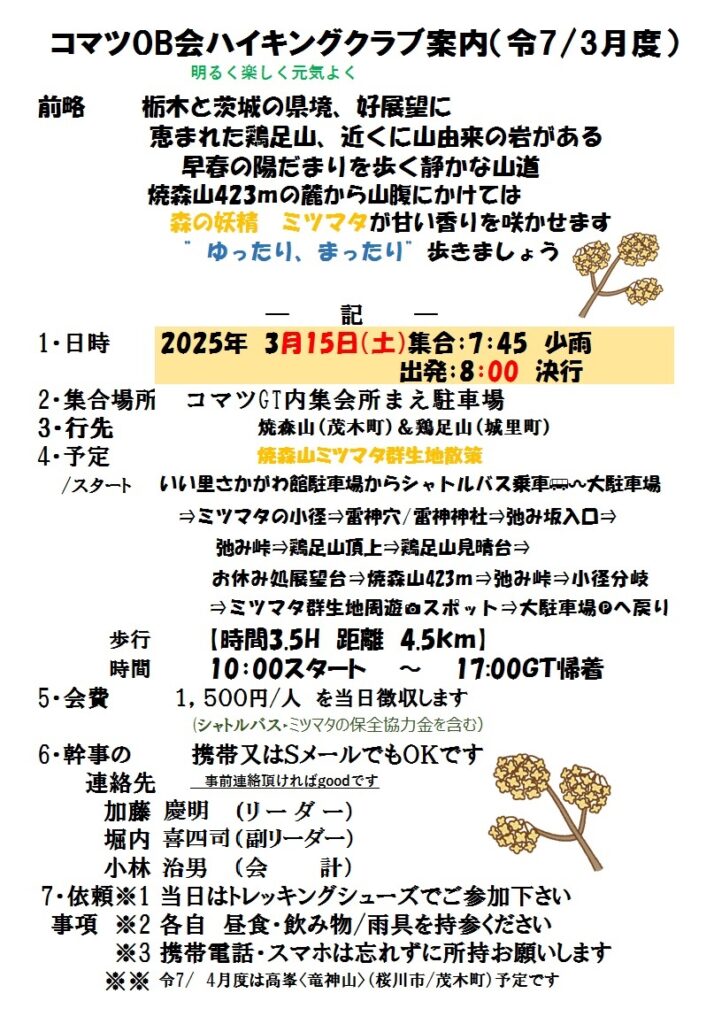 令和7年3月度のハイキングは 3/15(土) 茂木町&城里町_焼森山&鶏足山です。いい里さかがわ館駐車場からシャトルバスで焼森山ミツマタ群生地(300m)駐車場へ。焼森山&鶏足山に登った後、森の妖精ミツマタの花の群生地を散策します。皆様奮ってご参加下さい。詳細については下の案内状を参照下さい。会員の方にはLINEグループor直接案内状のハガキ郵送にてご案内しております。