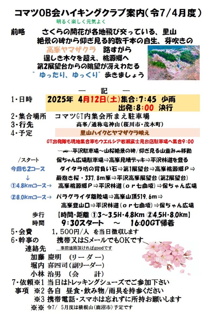 令和7年4月度のハイキングは 4/12(土) 茨城県桜川市・栃木県茂木町_県境の高峯519.6mです。「山桜絶景の碑」から、これから登る高峯の山桜群生を眺めた後に車で保ちゃん広場に移動。平沢林道を登り、第1・第2展望台から眺望を楽しみ、高峯を目指します。皆様奮ってご参加下さい。詳細については下の案内状を参照下さい。会員の方にはLINEグループor直接案内状のハガキ郵送にてご案内しております。