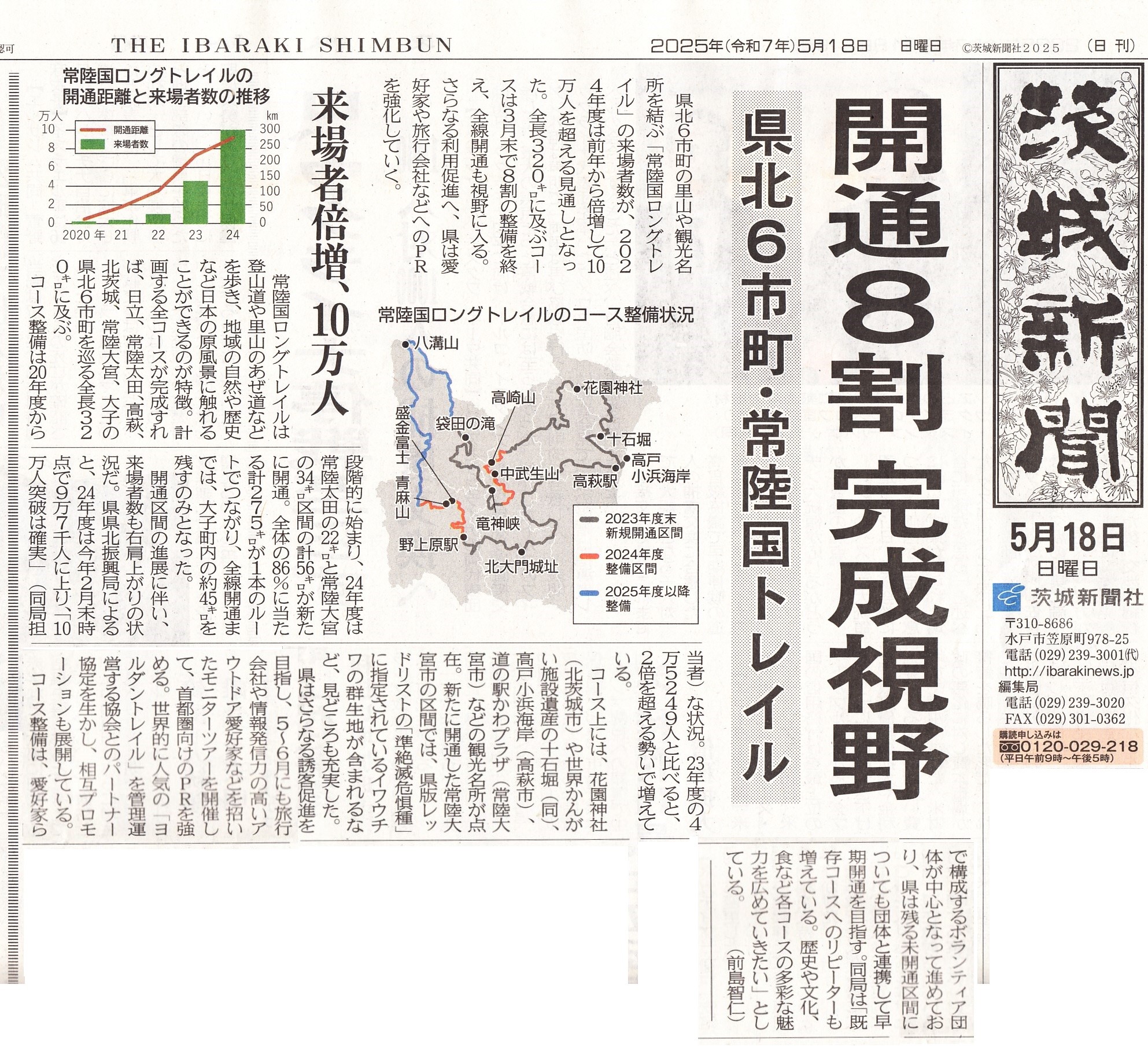 茨城新聞2025/5/18(日)付けの一面に掲載された、茨城県北6市町の里山や観光名所を結ぶ「常陸国ロングトレイル」を紹介します。