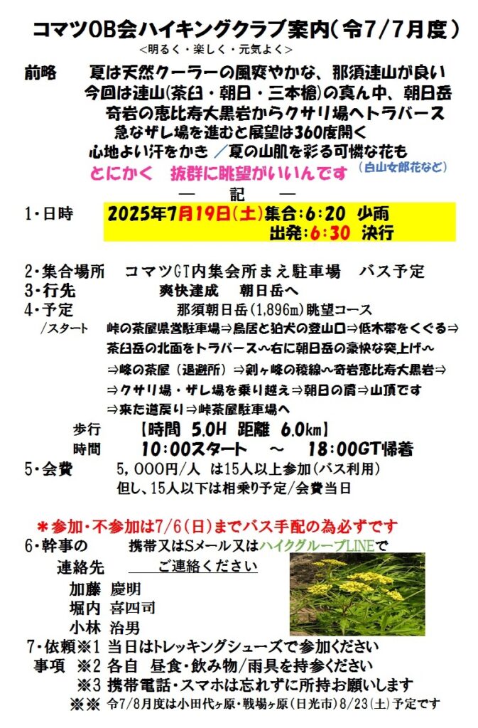 ハイキングクラブの令和7年7月度は 7/19(土) 現地まで往復楽々なバスハイク 、那須_朝日岳1896mです。峠の茶屋県営駐車場(標高1473m)をスタート&ゴールとし、峰の茶屋跡避難小屋・恵比寿大黒・朝日の肩と進み朝日岳山頂で折り返すコースです。皆様奮ってご参加下さい。コマツGT集合6:20と早いです。参加・不参加はバス手配のため必ず7/6(日)までに連絡下さい(参加15名以上=バス利用、15名未満=車相乗り予定)。詳細については下の案内状を参照下さい。会員の方にはLINEグループor直接案内状のハガキ郵送にてご案内しております。