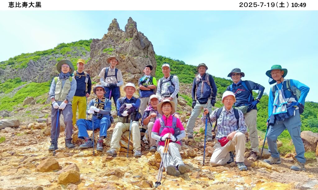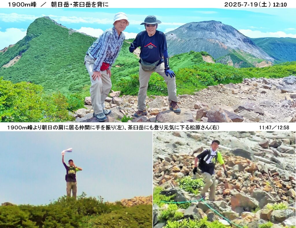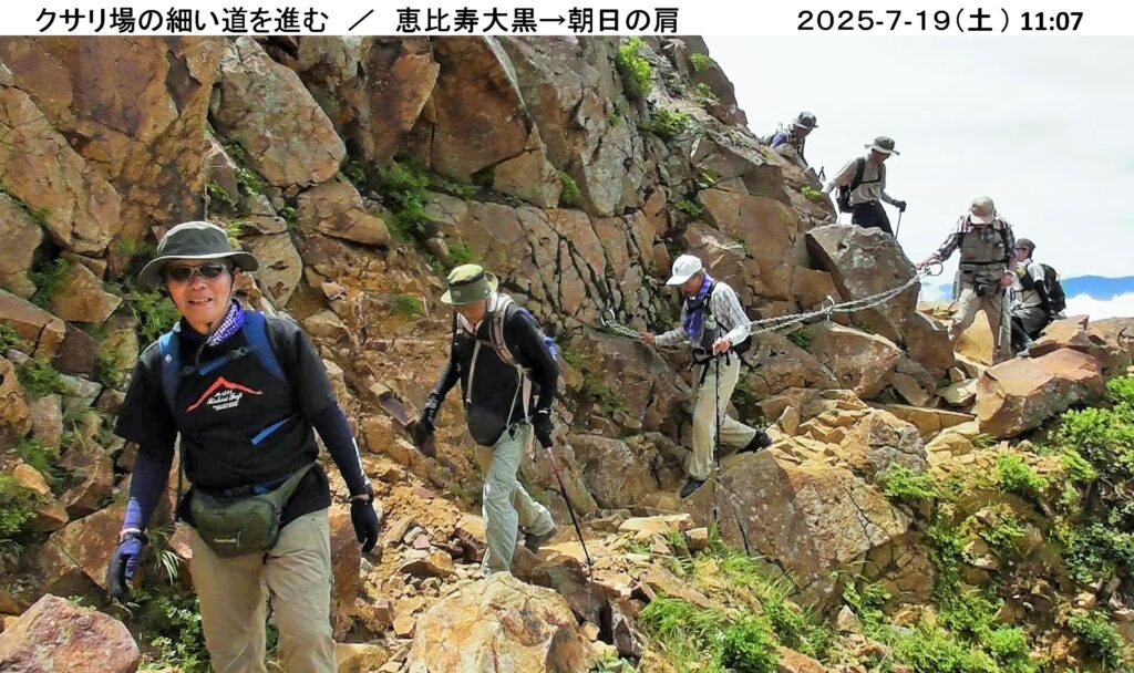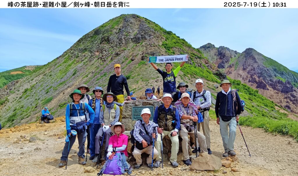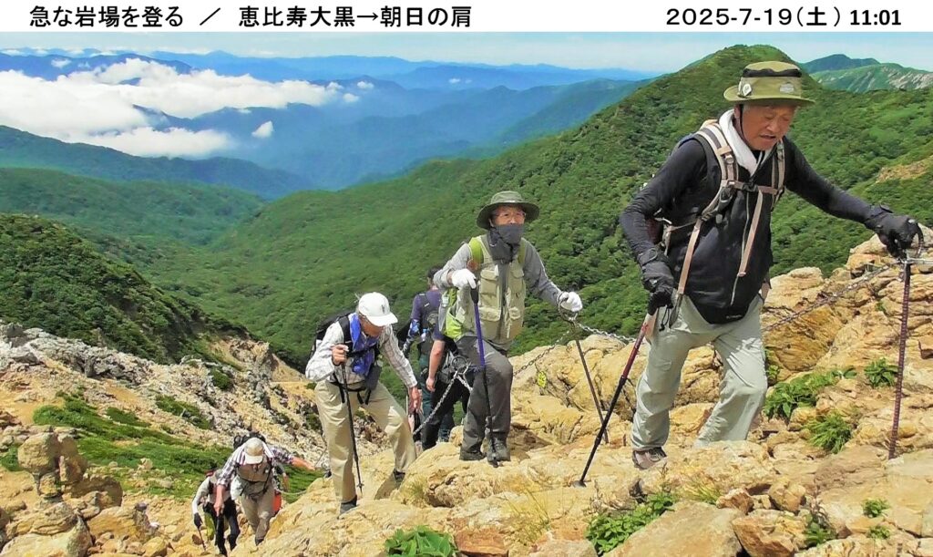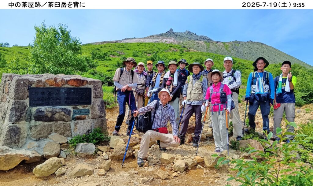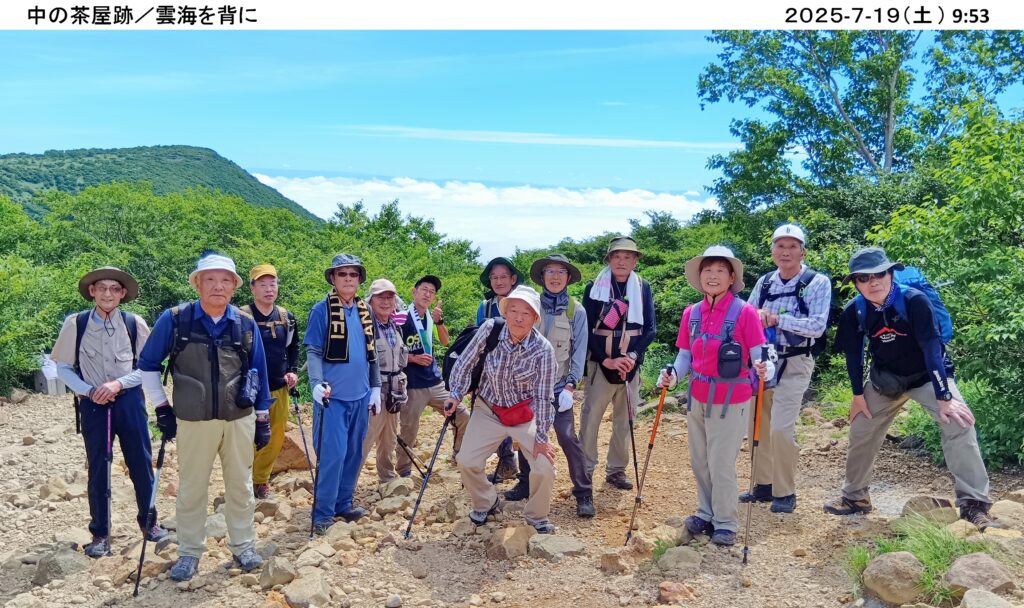 令和7年7月度ハイキングは、7/19(土) 那須五峰の一つ「峻嶮な朝日岳」を踏破するハイキングです。朝日岳は、過去3年、5度のハイキング計画がありましたが、全て、天候不順のため「途中下山or中止」となった”不遇な山”でもあります。今回、天候にも恵まれた事から、期待を込めて、参加者:13名、6:30 元気に出発です。途中、那須五峰は、曇に覆われ”一抹の不安”、ただ那須湯本を過ぎる頃から青空が見え始め、峠の茶屋(1,462m)到着時点では、紺碧な空となりました。勇む気持ちを抑えつつ、予定より40分早く、9:20登山開始。灌木帯を過ぎて見晴らしの良い”ザレ場”に至ると”雲上の世界に、気分高揚 ” 左に茶臼岳北面をトラバ-ス、右に赤壁の朝日岳を見ながら、爽やかな風が吹き込む登山道を峰の茶屋(1,720m)に向けて軽快に進む。峰の茶屋で休憩、想定以上に広がる雲海の景色に、全員 超満足な笑顔。これより、念願の朝日岳踏破に出発、剣が峰岩稜、恵比寿大黒を経由し、難関のクサリ場、ザレ場を乗り越え、”朝日の肩”到着。頂上は目の前、最後の力を振り絞って、朝日岳(1,896m)頂上に立つ。切り立った頂上からのパノラマ、茶臼岳/剣が峰/三本槍岳、雲海に浮かぶ遠き山々は、圧巻でした。”朝日の肩”に戻り、昼食となるが、食後の余韻に浸る仲間達を尻目に、高揚した気分を消化のため、”1,900m峰/茶臼岳”トレランする強者もおり、故障者もなく、全員が無事”念願の朝日岳踏破”、往復:約230kmの乗り合いハイキングでした。