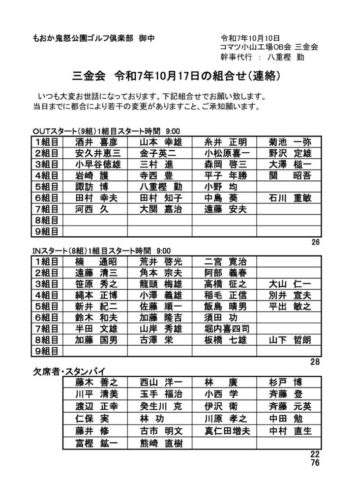 10月17日三金会ゴルフについて、若干名のキャンセルがありましたので組合せを添付の通り変更します。10月17日から9:00スタートに戻りますが、集合時間は8:00と変更ありませんので遅れることの無い様お願いします。