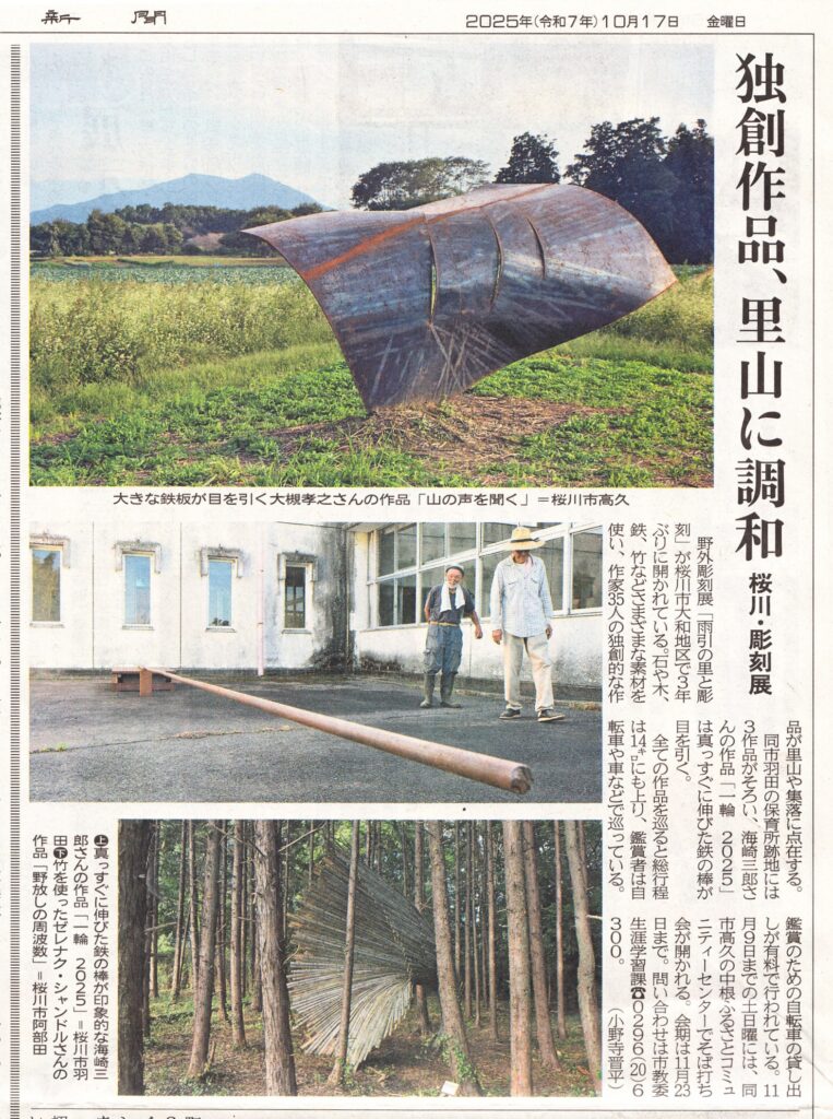 10/17(金)付け茨城新聞に「雨引の里と彫刻2025」が開かれている記事が掲載されました。3年ぶりの開幕で、石や木、鉄、土等さまざまな素材を使い、県内外で活躍する作家35人の作品が里山や集落に点在している。35作品を巡るには総行程14kmを徒歩・自転車・バスツアー等で鑑賞して回ります。