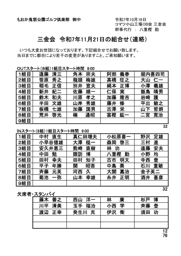 11月三金会ゴルフの組合せを添付の通りご連絡致します。都合で参加出来ない方は早めの連絡をお願いします。
