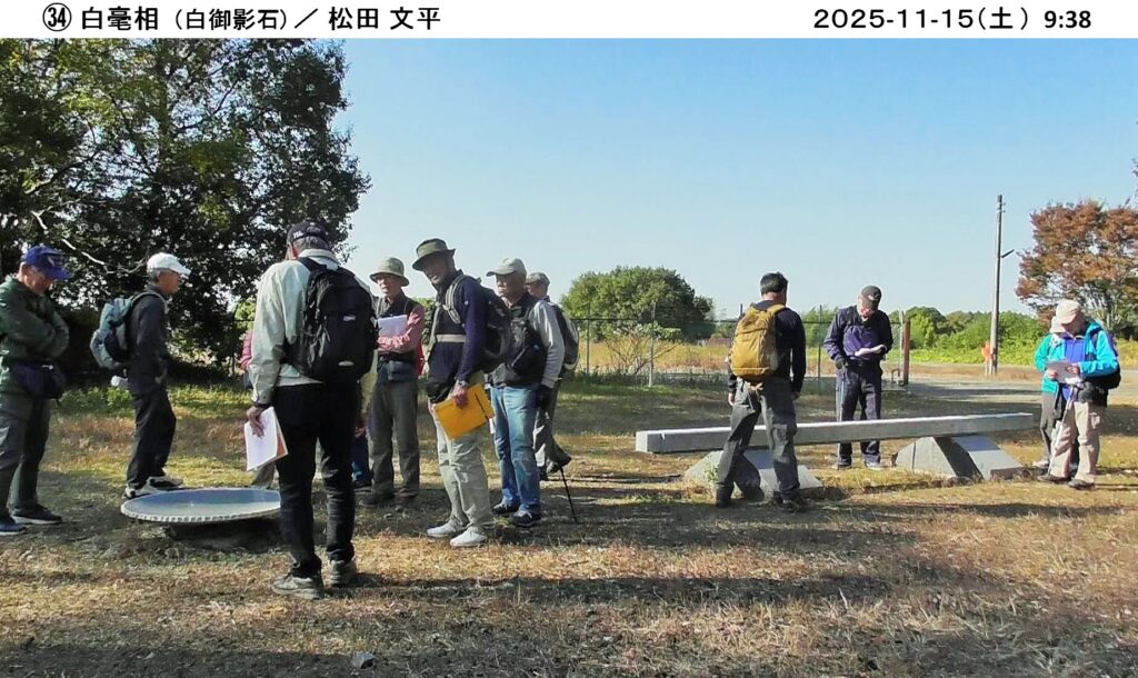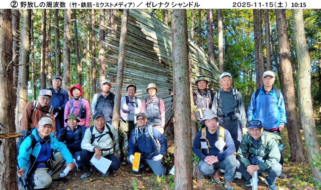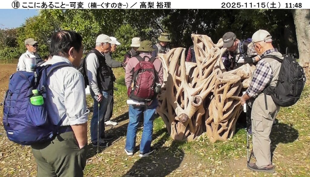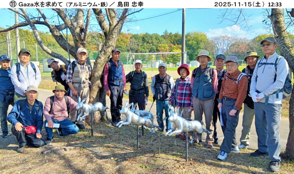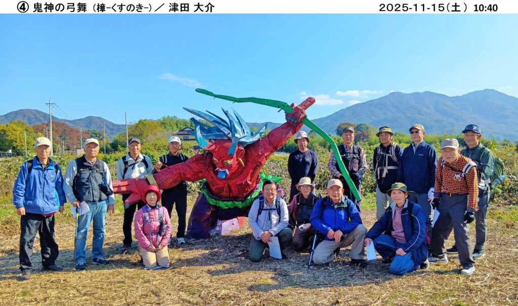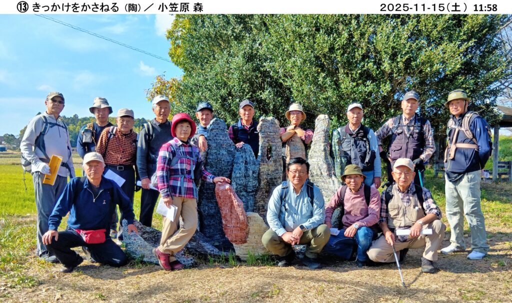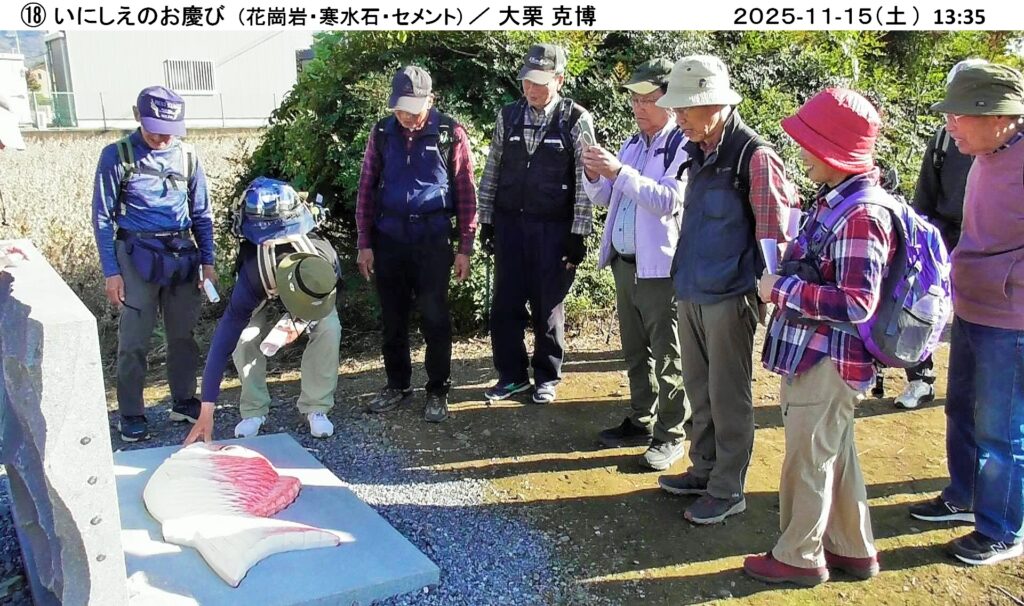 当日は15人が参加し、小春日和に恵まれ、大和ふれあいセンター『シトラス』から出発、ウオーキングコースは遠くに筑波山、加波山、雨引山が一望でき、また蕎麦畑、大豆畑が広がり、のどかな桜川市(旧大和村)のウオーキングを楽しむことができました。彫刻は35人の作者が、石(花崗岩、大理石、他)、木製、金属などで製作した様々な作品が里山や集落に設置されており、この中から30人の方の作品を鑑賞しました。このような自然の中に展示された彫刻を鑑賞するのは初めてであり、自然を満喫しながらの鑑賞も良い経験でした。案内パンフレットに書かれた各作家の作品名、コメントを読みながら鑑賞しましたが、4時間以上歩いての鑑賞のため、終盤は疲れの影響か作者のコメントも我々凡人には理解が難しく、<フーン>、<ヘー>、<ホー>の一言が多かったようです。今回はいつもの山登りと異なり、新しい試みを計画した幹事(加藤、堀内、小林)さんは、何度も下見をして、コース選択していただいたとのこと、有難うございました。(文 小林恒雄 / 写真 小林治男)