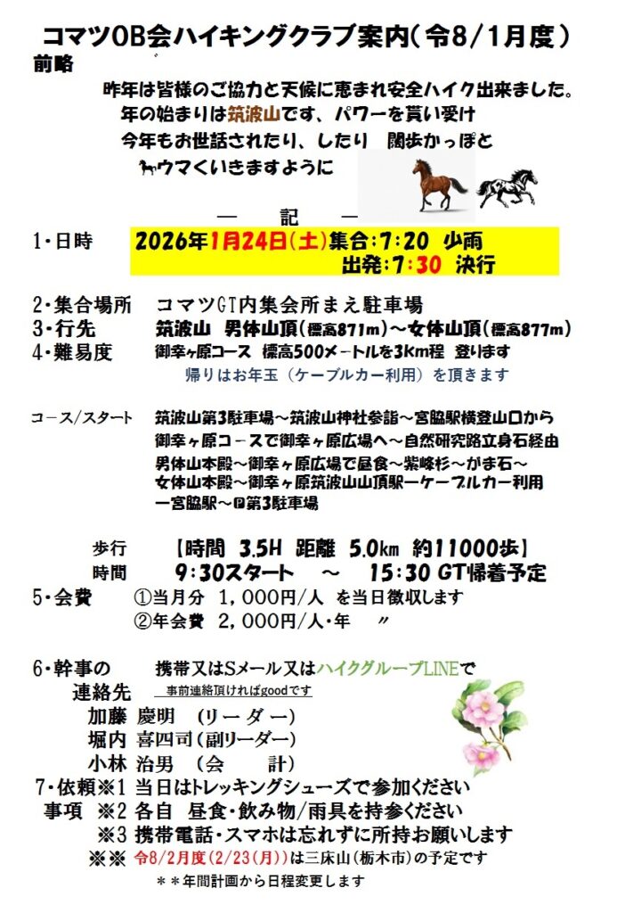 令和8年最初のハイキングは 1/24(土) つくば市:筑波山です。筑波山第3駐車場をスタートし、筑波山神社に参詣、今年一年の安全を祈願してから御幸ヶ原コースを登ります。男体山871m、女体山877mと周り、御幸ヶ原からケーブルカーで下山、駐車場へゴールとなります。皆様奮ってご参加下さい。詳細については下の案内状を参照下さい。会員の方にはLINEグループor直接案内状のハガキ郵送にてご案内しております。