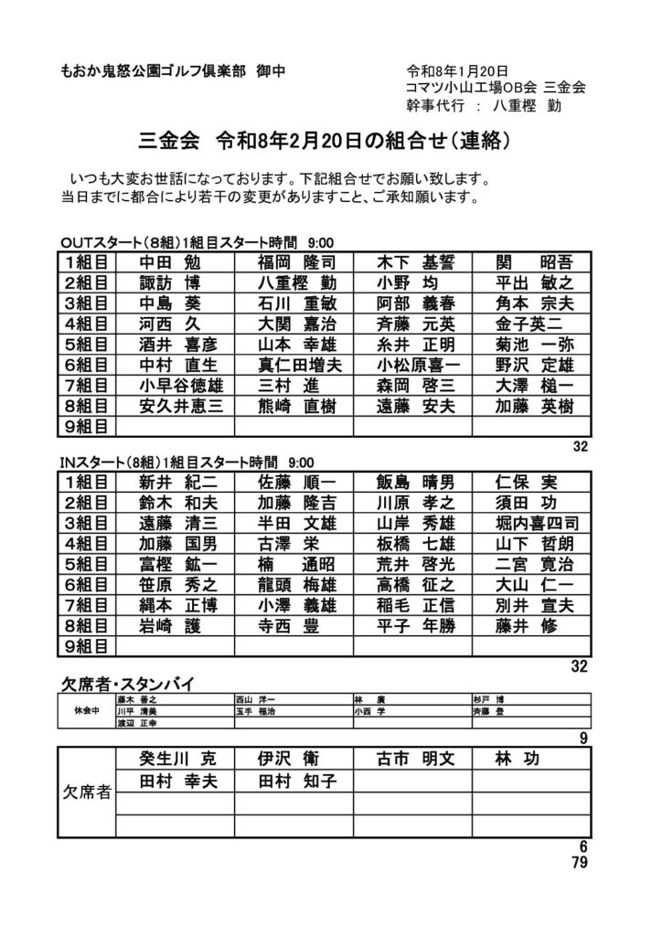 2月20日三金会の組合せを添付します。今回もスタート時間が早まる可能性が高い為、8時集合厳守お願い致します。