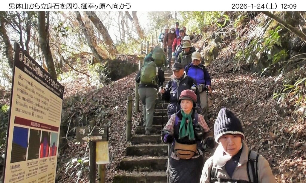 ・私は①のコ-スを、御幸ヶ原コ-スはかなり急登で階段や岩場も多く高齢者や初心者にとってはかなりキツイコ-ス、更に男体山と女体山も登るので気力と体力が必要です。私も昨年後期高齢者の仲間入りし体力的な衰えを実感するこの頃でしたが仲間と励まし合い、仲間と歓談しながらの昼食等で癒され何とか今回のミッションを達成出来ました。これからも皆について行ける様に感じる年初のハイキングでした。(文 堀内 / 写真 小林)